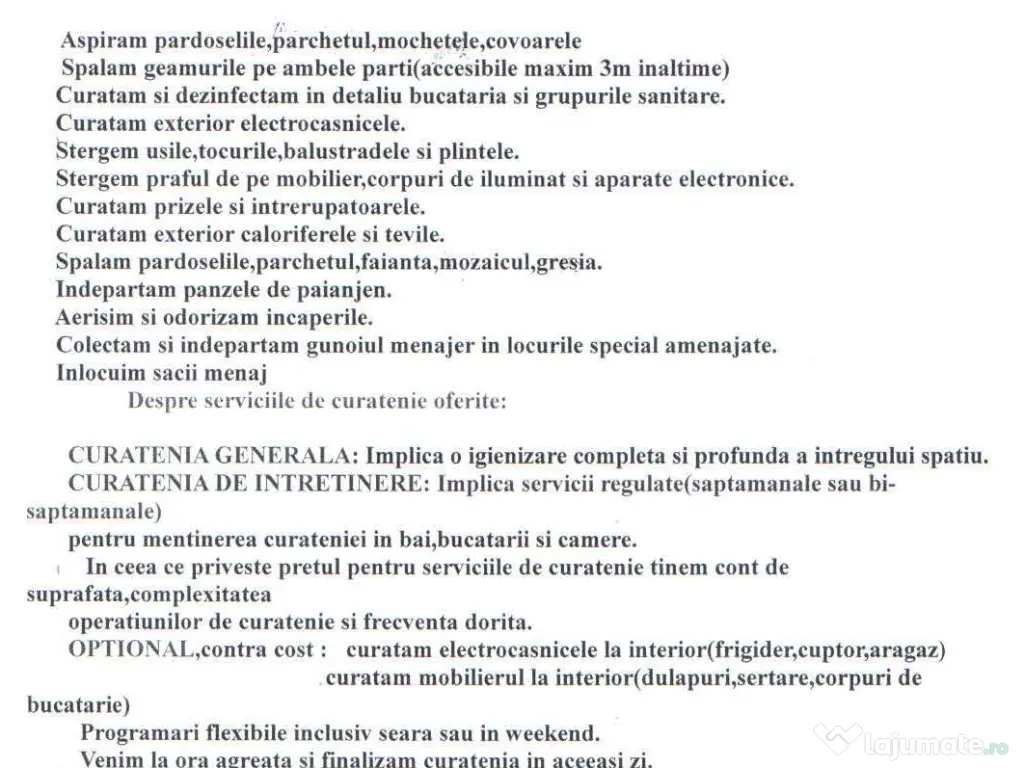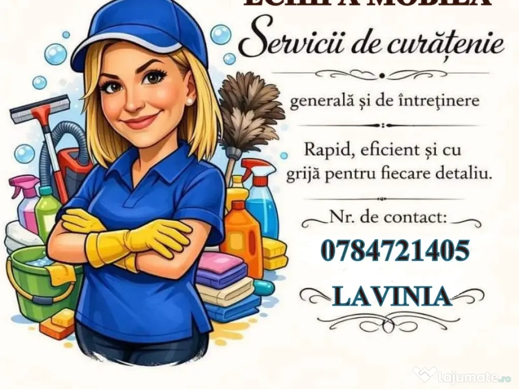 Echipa mobila de curatenie.Daca nu ai timp lasa CURATENIA in grija noastra si bucura-te de un camin impecabil.Detalii si oferta personalizata la telefon:0784721405 sau e-mail:[email protected].
