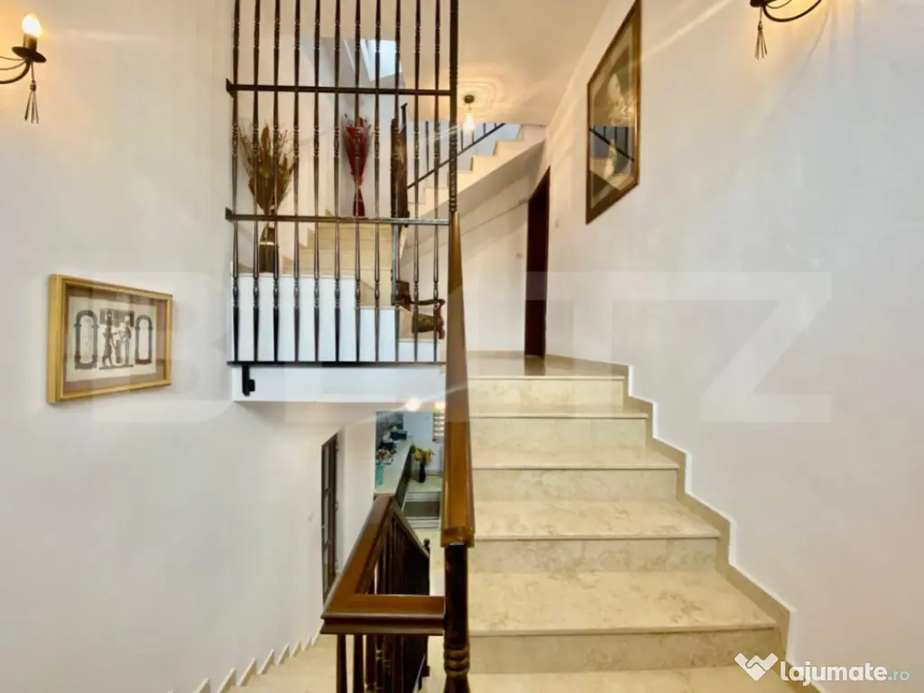 Blitz propune spre vânzare o proprietate remarcabilă în Târgoviște, ce se distinge prin arhitectură, spațiu generos și finisaje de înaltă calitate. Cu 8 + camere, 2 băi, o suprafață utilă de 286 mp și un teren armonios proporționat de 647 mp, imobilul oferă confortul și funcționalitatea unei locuințe premium. Sistem de Securitate Sensorizat Exterior/Interior. Parterul impresionează prin livingul luminos și spațios, open concept cu Camera de zi completat de un birou/dormitor pentru oaspeți, baie, bucătărie și chicinetă, în timp ce etajul găzduiește trei dormitoare ample, un dressing și o baie elegantă. Mansarda, amenajată pentru locuit, este folosită în prezent ca sală de sport și spațiu de depozitare, oferind însă flexibilitate pentru diverse destinații. Renovarea completă din 2020 a adus finisaje premium — marmură, travertin, parchet din lemn masiv, tâmplărie Salamander, usi de calitate de la Megadoor, acoperiș Lindab și izolație de 10 cm — precum și instalații noi și aer condiționat pe fiecare nivel. Atat Mobilierul din lemn masiv, care completează eleganța întregului ansamblu, cat si Electrocastnicile existente sunt inclus în preț. Proprietatea dispune totodata de un beci, de 30 mp, o terasă închisă și încălzită tot de 30 mp cu acces direct în casă, o terasă de vară de 25 mp și o anexă de 30 mp cu grătar, magazie și toaletă exterioară. In apropiere se afla Parcul Chindiei, Piata Doi Brazi, Gradinita Nr. 2, Scoli, Licee, Restaurante si tot ce iti doresti. Această proprietate este potrivită atât pentru o familie care își dorește spațiu, rafinament și intimitate, cât și pentru amenajarea unei grădinițe, școli private, clinici sau a unui sediu de birouri de prestigiu. DISTANTE: 1 Ora - 20 Min. de Bucuresti / 45 Min. de Ploiesti / 1 Ora- 15 Min. de Sinaia / 1 Ora - 10 Min de Pitesti / 2 Ore de Brasov. IMPORTANT: Aceasta oferta se propune atat spre vânzare cat si la schimb cu casa mai mică tot în Targoviste, sau schimb cu apartament plus diferența. TE ASTEPTAM LA VIZIONARE! - Pentru a transforma această proprietate eleganta în noul tău cămin sau sediu. Cod ofertă / ID BLITZ: P159071 Id intern: P159071 Număr niveluri imobil: 1 Număr Băi: 2 Curent Apă Canalizare Gaz Climă