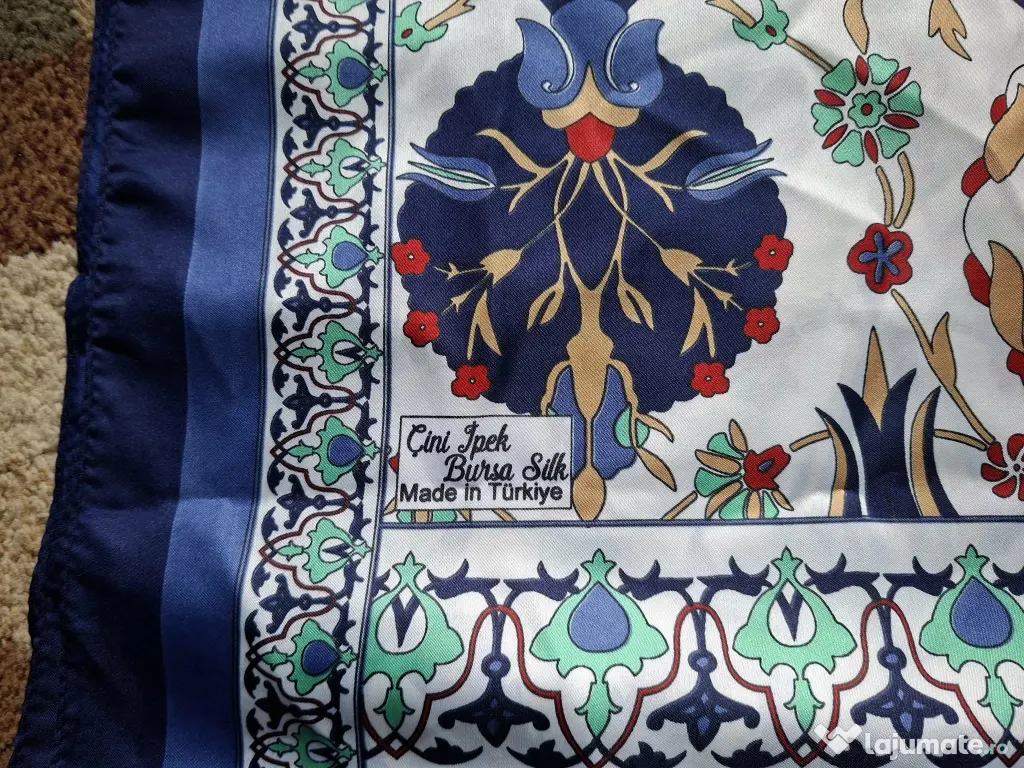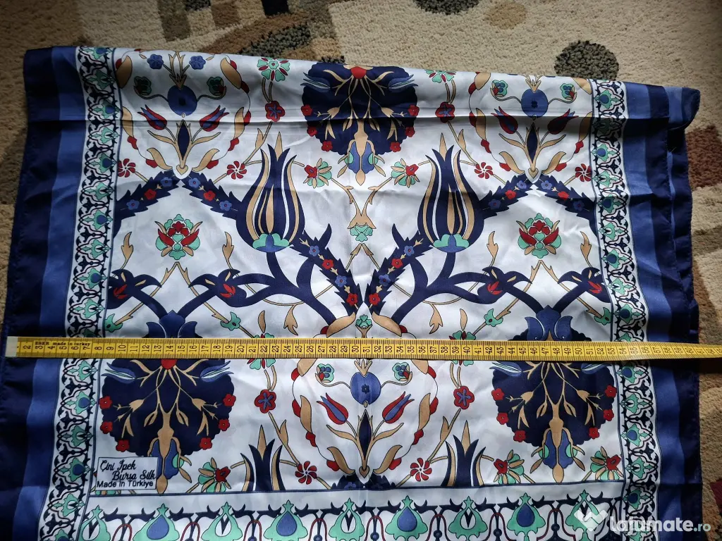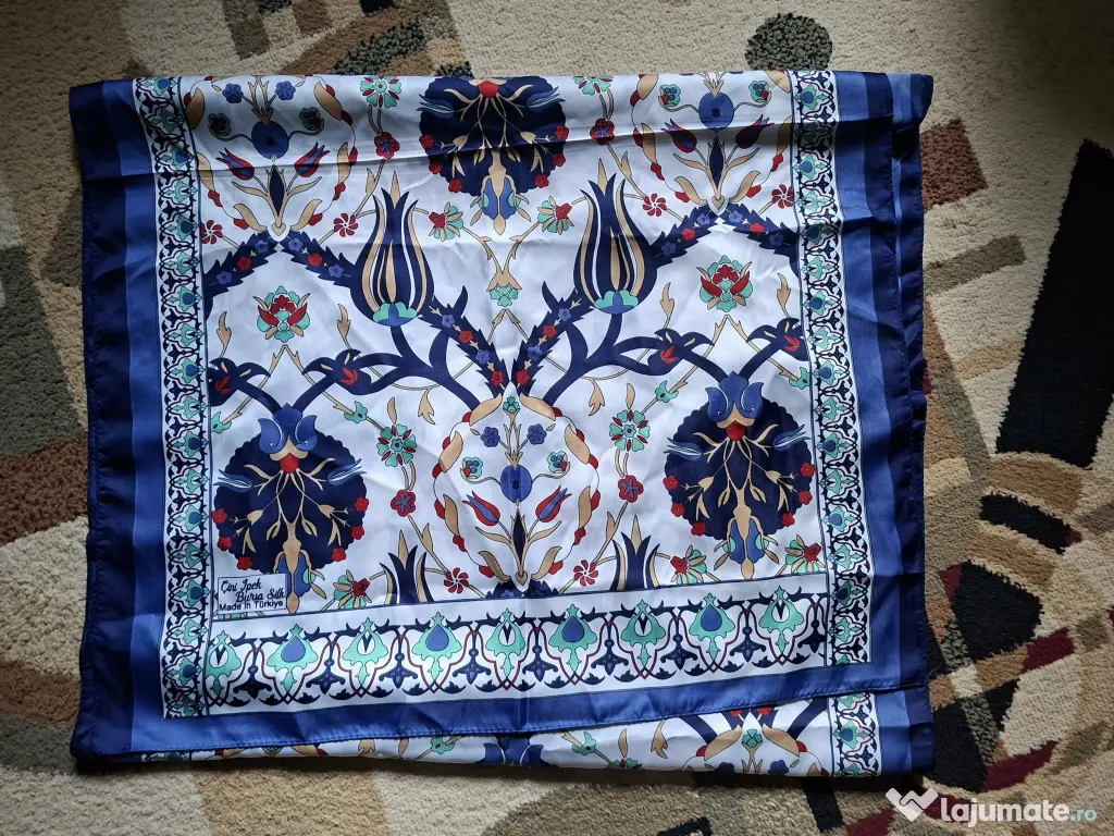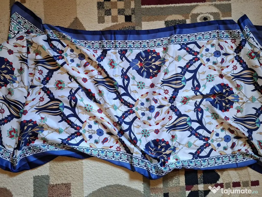 Esarfa albastra cu modele, cumparata anul trecut din Turcia, din matase, noua, nepurtata, dreptunghiulara, latime 60 cm si lungime totala 165 cm.