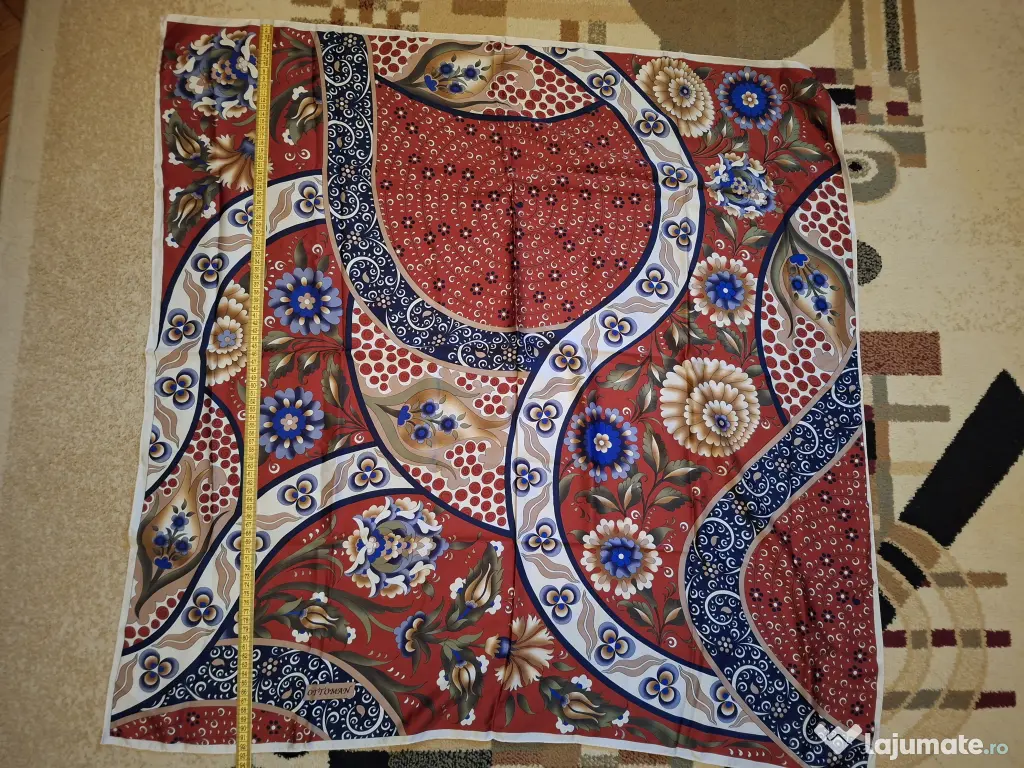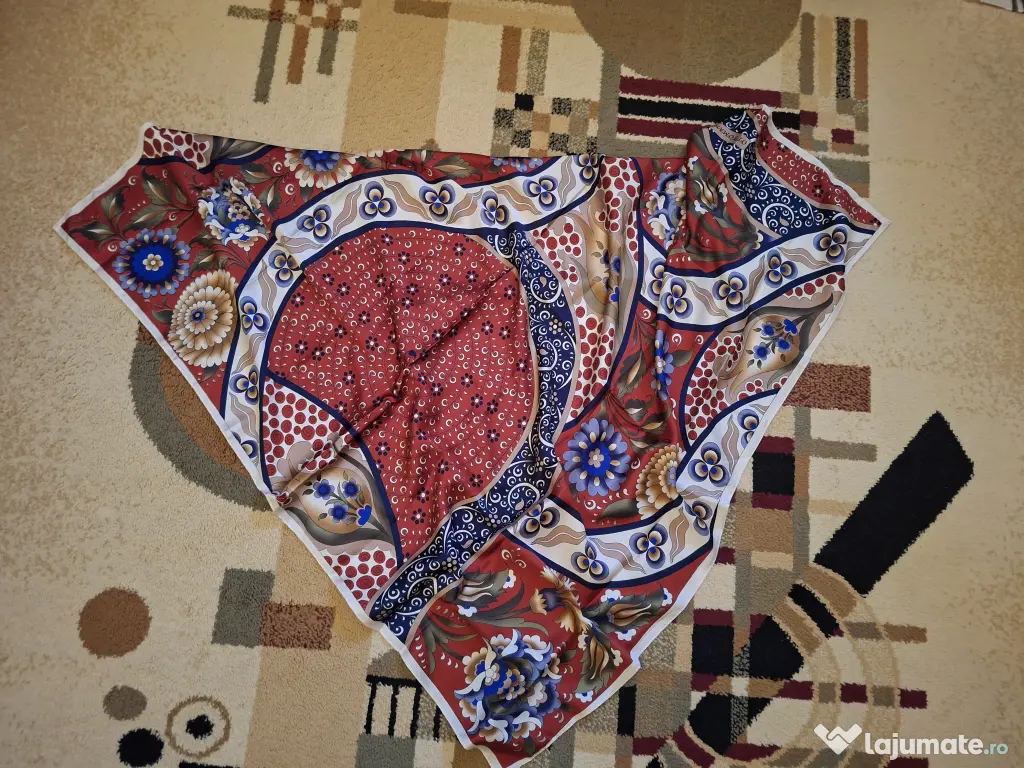 Esarfa multicolora, cumparata anul trecut din Turcia, din matase, noua, nepurtata, patrata, 93 cm. Predare personala in Bucuresti la piata Victoriei sau transport curier cu plata la cumparator.