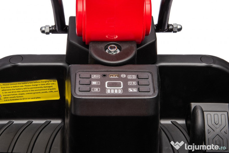 Benficiati de GARANTIE 24 Luni Transport GRATUIT Pentru comenzi si info contactati-ne 0729189471 Excavator electric Kinderauto X7 2x 55W, 12V-12Ah, Premium Scaun tapitat cu piele ecologica, confortabil pentru copil Senile cauciucate, silentioase si confortabile Brat incarcator, actionat manual din manete Nivelator actionat manual din maneta Compartiment depozitare 2 motoare electrice de putere 55W la teniune 12V, total 110W 12V Echipat cu baterie reincarcabila de 12V 12Ah Flash player cu mutiple functii: Butoane pentru schimbarea sensului de mers inainte/inapoi Butoane pentru control volum Buton pentru activat functia de rostit povesti Buton pentru activare sistem de iluminat cu LED Buton pentru activare divertisment sonor Conexiune Mp3 prin port USB, port Jack 3.5" si Bluetooth Sitem de alimentare 12V, Pornire/Oprire din Buton Pornire LENTA pentru confortul copilului Oprire LENTA pentru confortul copilului Produsul include INCARCATOR 12V 1Ah Telecomanda pentru control parental de la distanta Excavatorul se mai poate ghida manual de catre copil Indicator nivel baterie, afisat pe music player Centura de siguranta Greutate proprie 23.8 Kg Greutate total admisa 53.8 Kg Suporta o greutatea utila in scaun de 30 Kg Produs recomandat pentru copii 24-84 luni Dimensiunile produsului montat 130 x 58 x 83 cm Puteti cumpara acest produs in RATE, fara dobanda, cu CARD de cumparaturi de la banci partenere precum: Raiffeisen / Star BT / BCR / BRD Finance / Alpha Bank /First Bank. Pentru comenzi si info contactati-ne 0729189471 SAU IN RATE CU DOBANDA PRIN TBI PAY.