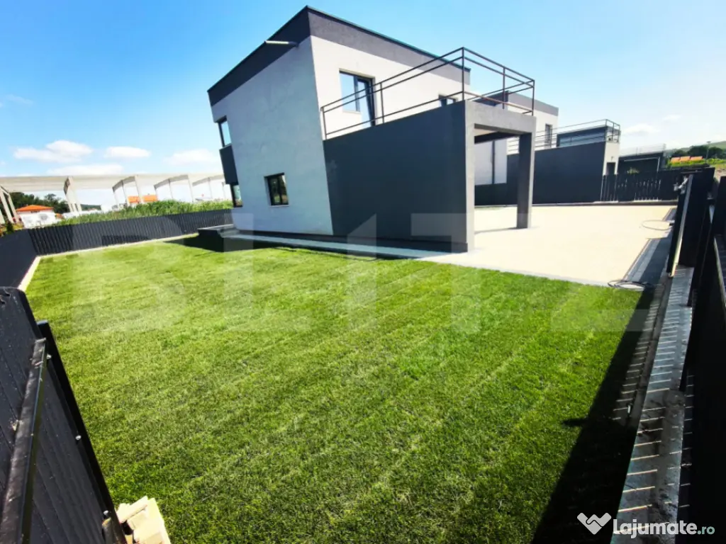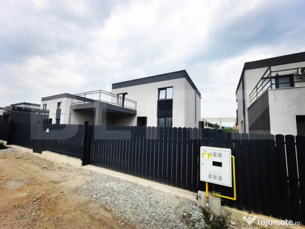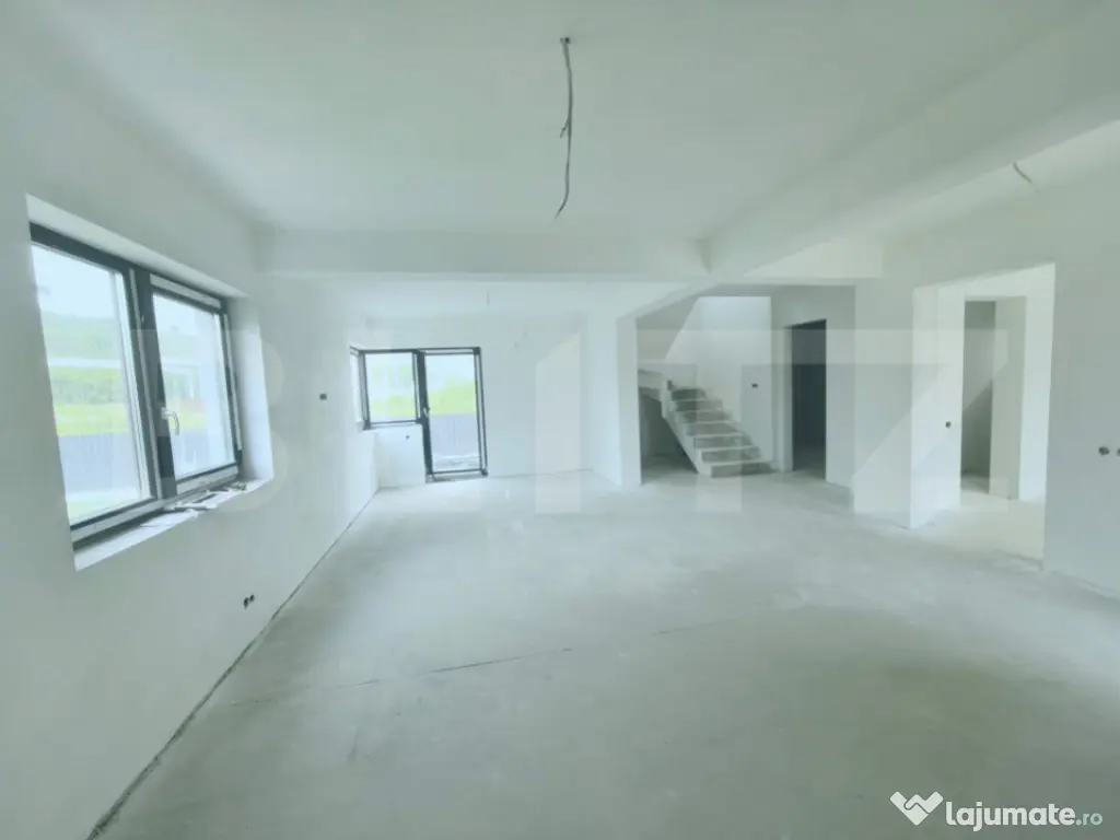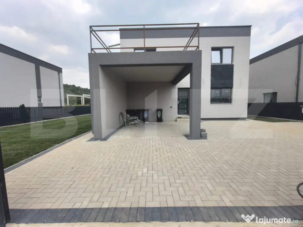 Blitz oferă spre vânzare casa individuala, 120 mp utili si 400 mp teren, intr-un ansamblu de case unitar si armonios proiectate, la câteva minute de Cluj-Napoca., zona intrare Jucu. Proprietatea construita si finalizata in 2024, are pereții din cărămida cu izolație exterioara, ferestrele si usa intrare tamplarie PVC si sticla termoizolanta , parcare acoperita. Imobilul este dispus pe doua niveluri, P+E, având următoarea compartimentare: Parter : hol, bucătărie separata, cămara, living, baie de serviciu; Etaj : 3 dormitoare, 1 baie, doua dressing-uri. Dormitorul matrimonial are ieșire pe o terasa panoramica de 18,5 mp, însorită pe tot parcursul zilei. Se vinde la stadiul de semifinisat, cu sapa, pereți gletuiti, un rand de lavabila, instalații la poziție, centrala termica pe gaz, încălzire in pardoseala. Curtea este amenajata, gazon, trotuare si  de acces cu  pavaj , gard metalic, poarta acces auto automatizata. Imobilul este poziționat într-o zona liniștită, retrasa de zgomotul și poluarea orașului, dotata cu facilitățile unei zone rezidențiale moderne, utilități (branșamente de apa, gaz, canalizare ) strada privata, cu iluminat stradal ! Cod ofertă / ID BLITZ: P155187 Id intern: P155187 Număr niveluri imobil: 1 Număr Băi: 2 Nr. locuri parcare: 2 Curent Apă Canalizare Gaz