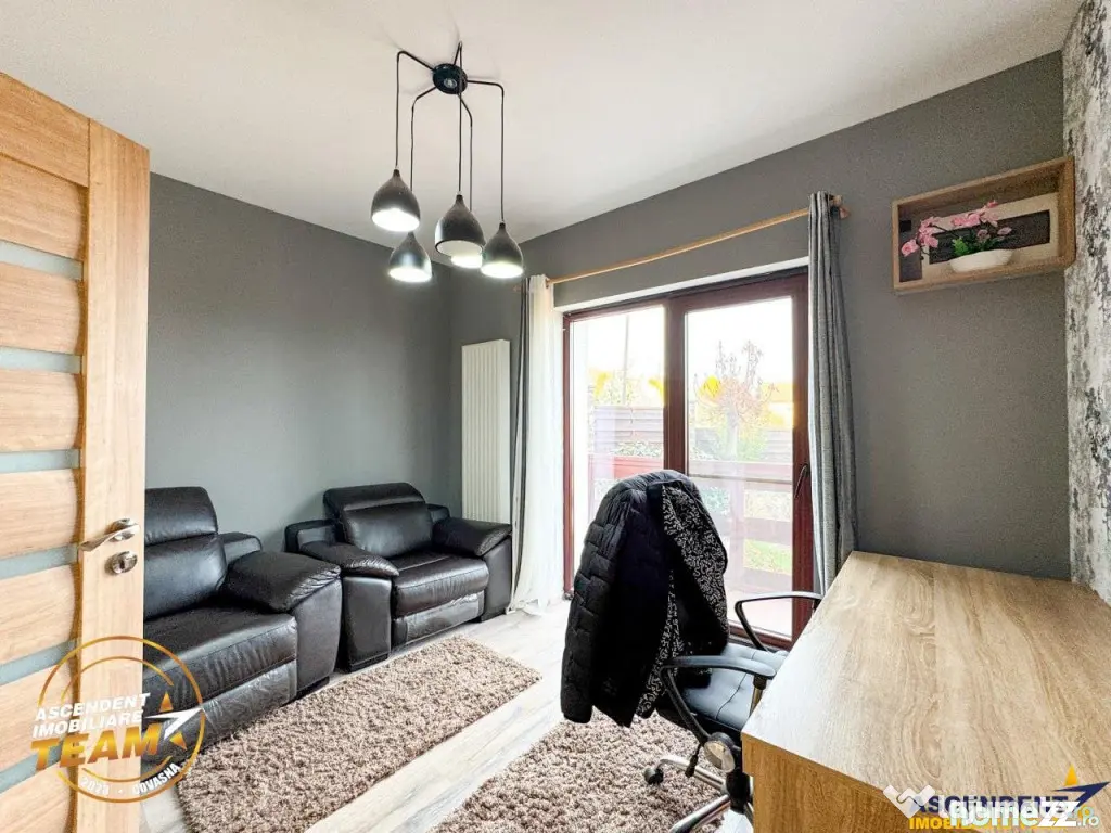 La acelasi nivel se afla si o camera transformata in birou mdash; un spatiu intim, linistit, ideal pentru lucru sau lectura mdash; precum si o baie moderna, amplasata convenabil pentru a deservi intreaga zona de zi.