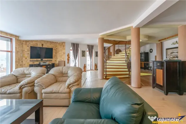 Scara interioara, realizata din lemn masiv, alaturi de parchetul din aceeasi esenta nobila, contribuie la atmosfera calda si sofisticata a spatiului.