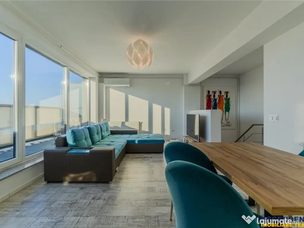 Situat la etajul 8 dintr-un bloc cu 9 niveluri, elegantul Penthouse are o suprafata utila de 99 mp, este dotat cu aer conditionat in zonele principale, tamplarie PVC cu geam tripan si o buna izolare termica, certificata prin clasa energetica B