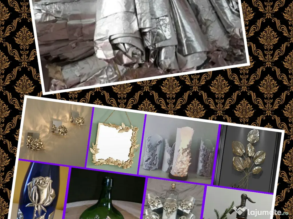 Folie staniol special NOI din pachete tigari pentru proiecte de arta ca cele cateva exemple ce se pot vedea in foto, gen aplica de perete, lampi de masa, oglinzi decorative, ornamente de perete, set retro, sticle diverse, borcane, pahare, etc