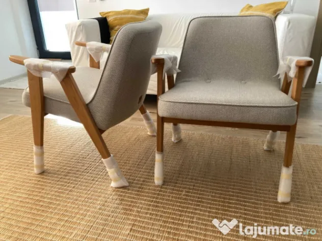 Fotoliile cu manere si picioare din stejar, sunt noi, nefolosite, potrivite la interior intr-o cafenea sau living. Mai multe detalii pe pagina oficiala 366concept punct com.