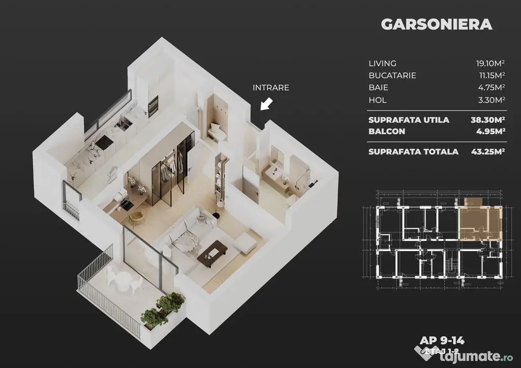 Pe langa schita care corespunde garsonierei propuse pentru vanzare, aveti atasate si randarile ansamblului/blocului din care face parte, dar si cateva fotografii dintr-un proiect asemanator finalizat si vandut integral in urma cu cateva luni, al aceluiasi dezvoltator.