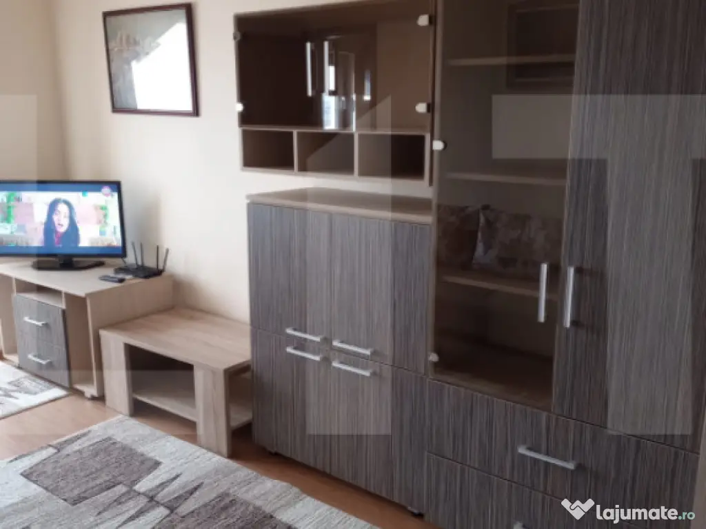 Amenajare: Spațiu mobilat modern, cu un living generos ce include o canapea extensibilă și corpuri de depozitare bine organizate.