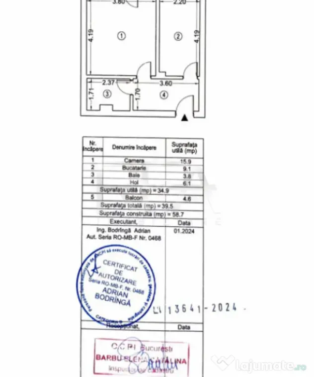 • Suprafață utilă: 34.9 mp + balcon de 4/6 mp (suprafață construită totală: 58.7 mp);