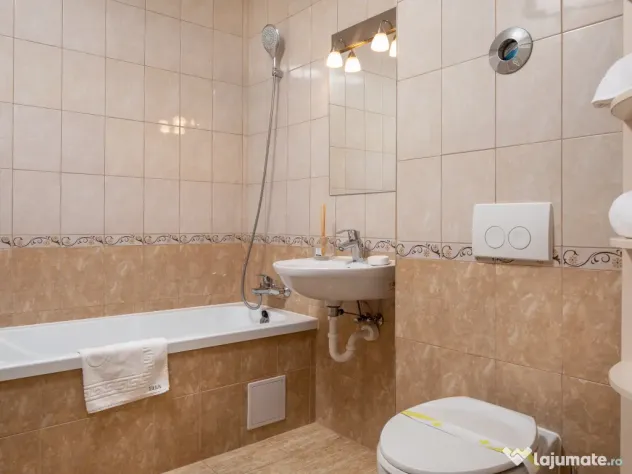 Garsoniera are loc de parcare, aparat de aer conditionat masina de spalat, centrala termica proprie, internet, TV, frigider, plita, cuptor electric si cu microunde, parchet si faianta etc.