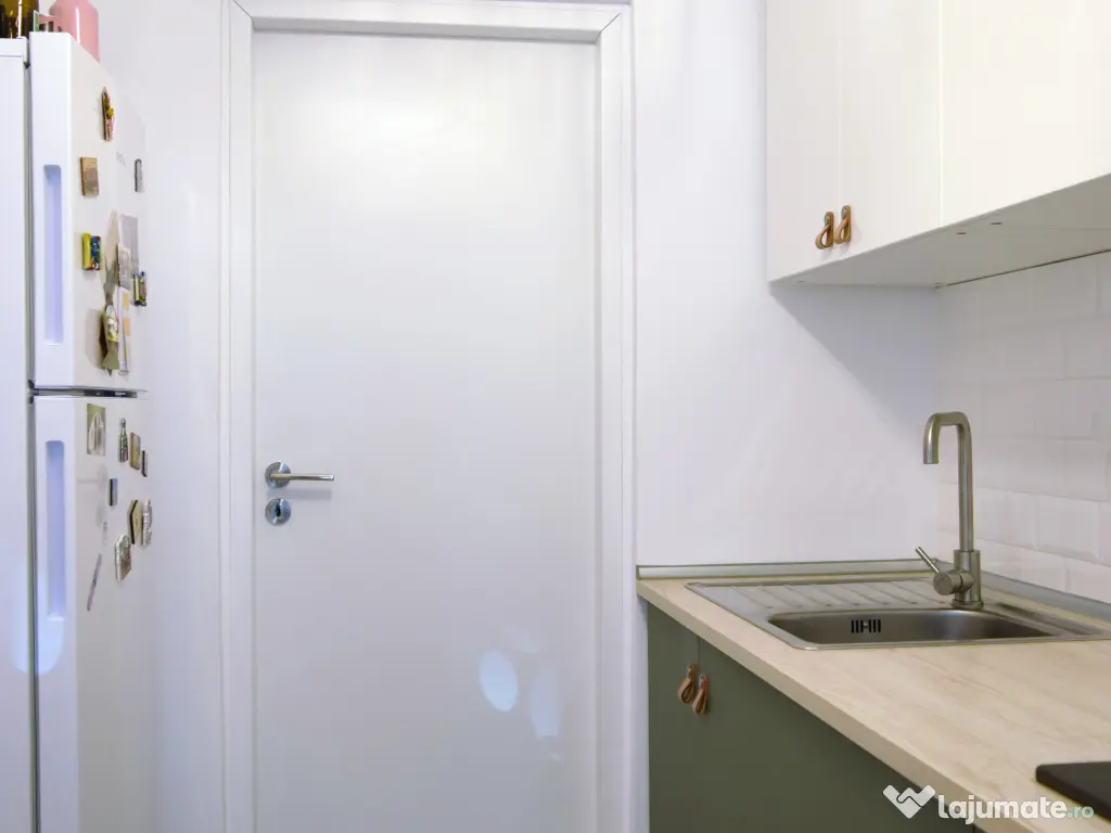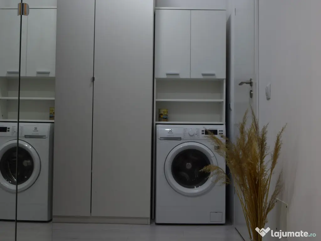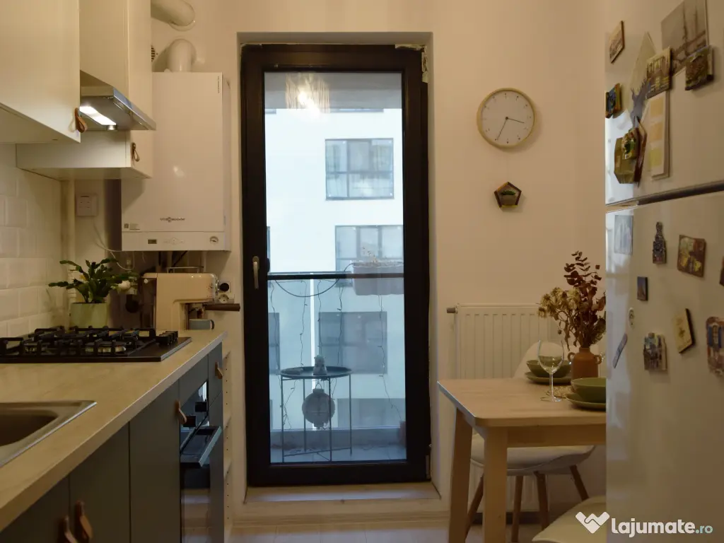 Bucătăria este complet utilată: plită pe gaze, cuptor electric, hotă, frigider și detector de gaze. Mașina de spălat rufe este amplasată în hol.