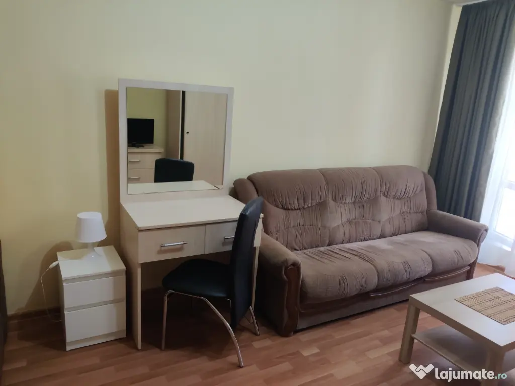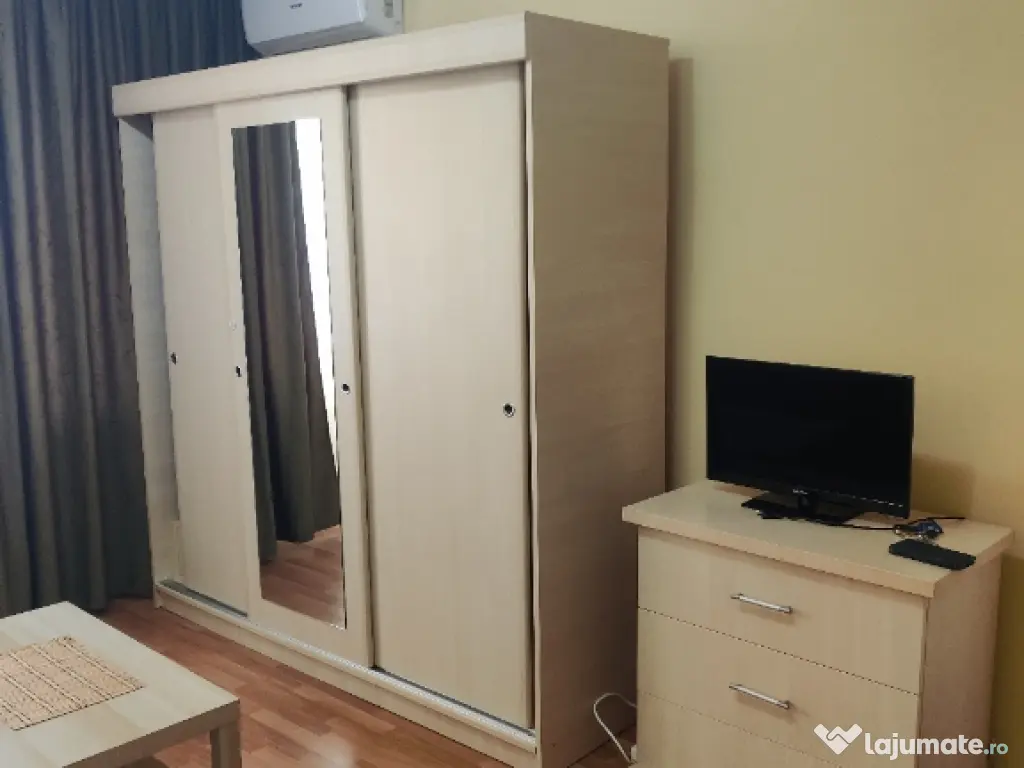 Garsoniera are două canapele extensibile mari, aer condiționat, șifonier cu 3 uși culisante și oglindă încorporată,corp de toaletă cu oglindă și sertar, comodă tv cu 3 sertare, măsuță joasă, două scaune de imitație piele, noptieră, tv led, aspirator stendin de rufe, 3 mochete, perdele draperii