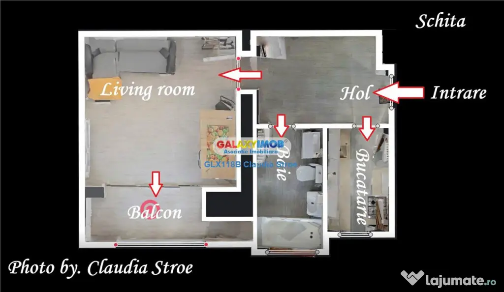 Daca turul virtual nu te-a ajutat suficient sa iti faci o idee despre compartimentare, iti spun eu: garsoniera este decomandata, cu o suprafata de aproximativ 40 mp, si este compusa din: