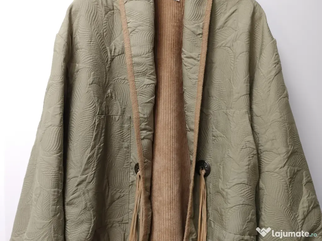 Geaca gofrata, purtata, stare foarte buna, verde militar, căptușită cu velur, manșete velur, foarte moderna, accesorizată cu șnururi din piele ecologica, in zona nasturilor.Negociez prețul și suport cheltuielile de transport!