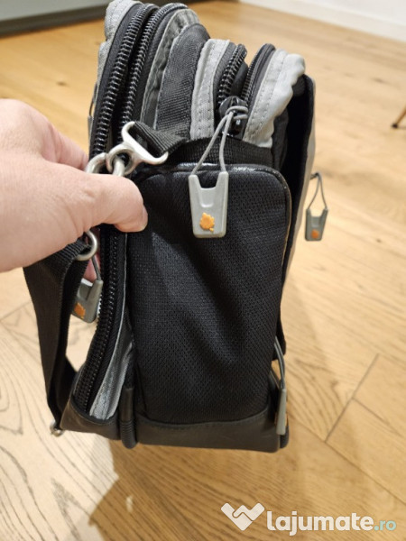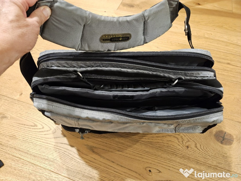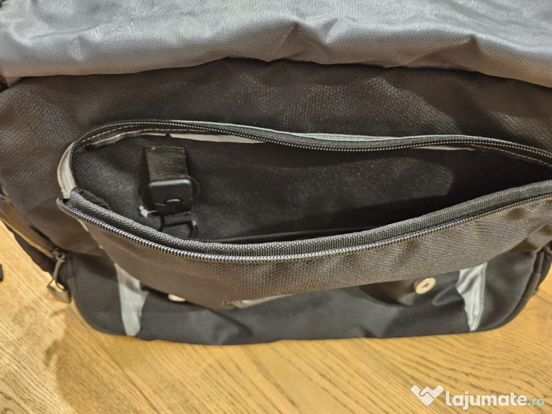geanta laptop 17" Geanta pentru laptop , cu 2 compartimente si multiple buzunare. Cele 2 compartimente principale sunt dotate astfel: - 1 compartiment cu 3 fante pentru dosare, acte diverse - 1 compartiment cu buzunar captusit pentru laptop de 17" si alte 5 buzunare Clapeta capac are un buzunar cu fermoar iar sub ea exista alt buzunar mare cu alte buzunare mici. Pe spatele gentii si in lateral, exista alte 2 buzunare cu fermoare Curea de umar reglabila, captusita si maner. Fundul gentii este prevazut cu intarituri. Dimensiuni: 35 x 45 x 15cm geanta este utilizata insa nu are semne de uzura intensa, fermoarele sunt impecabile.
