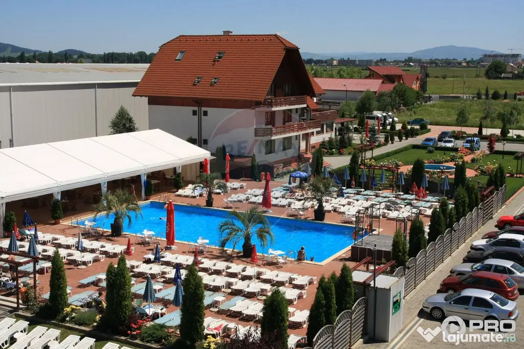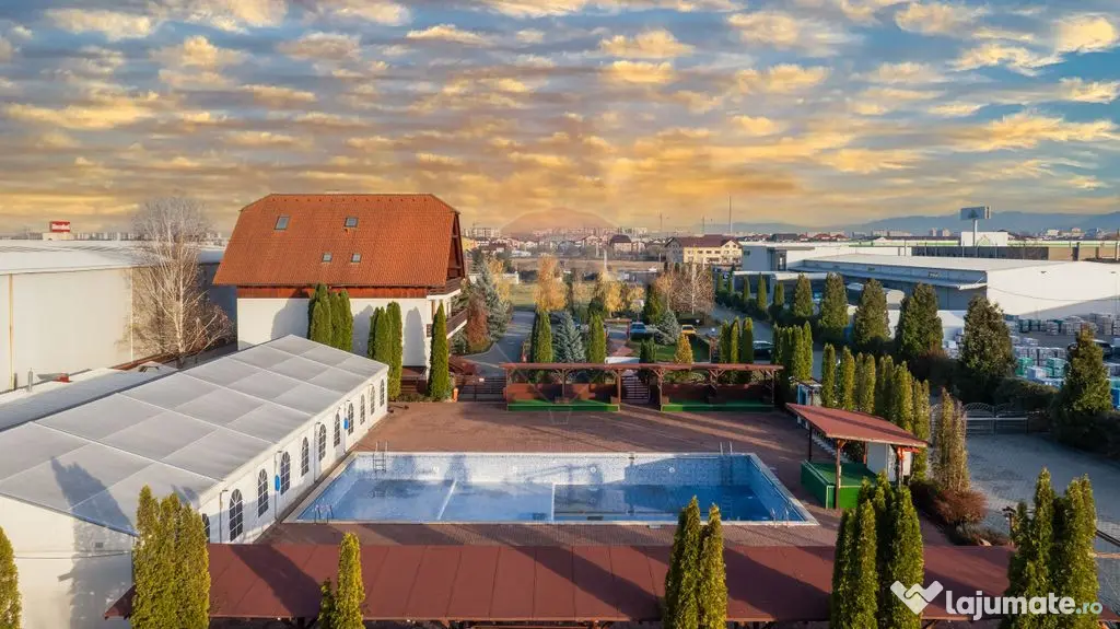 Proprietatea are o suprafață de teren de 18.080 mp, pe care sunt amplasate clădirile existente, piscina, cortul pentru evenimente, zonele de relaxare și o parte extinsă de teren liber ce poate fi valorificat în multiple direcții.