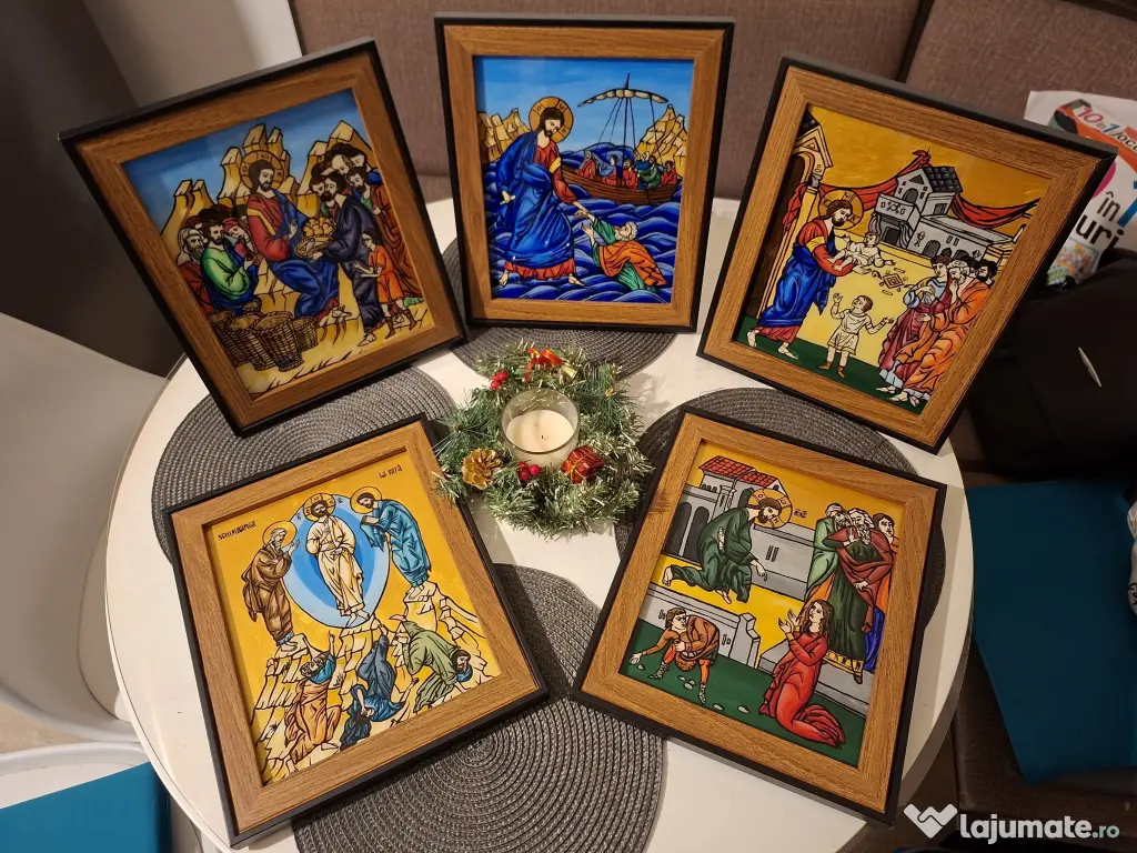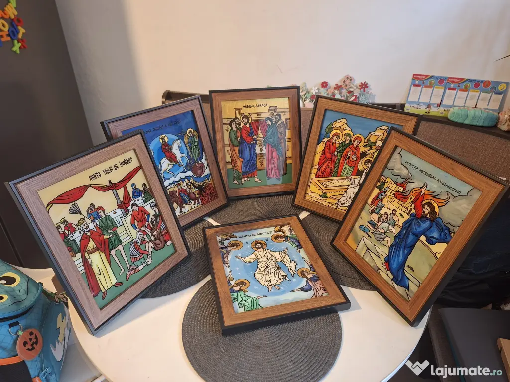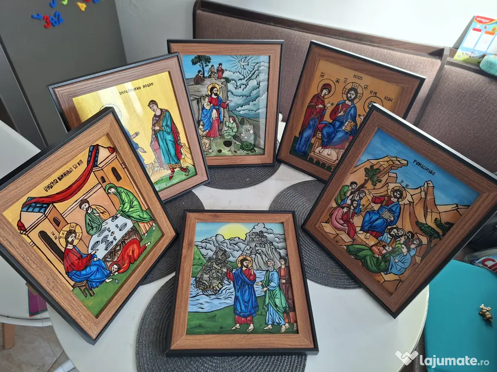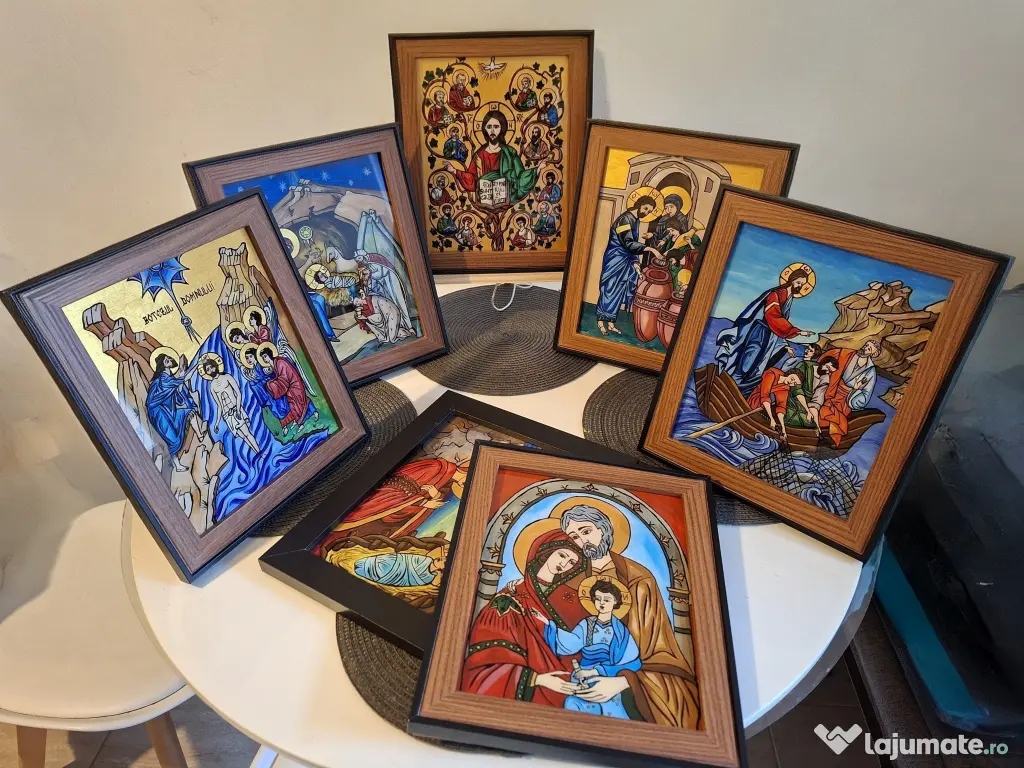 Picturile se realizeaza pe sticla, in culori acrilice non-toxice, rezistente la lumina, aurirea se realizeaza cu pigment de rasina acrilica. Rame noi. Pentru mai multe detalii, va rog sa lasati mesaj la anunt. Pictez icoane si la comanda, disponibilitate de colaborare pentru proiecte.