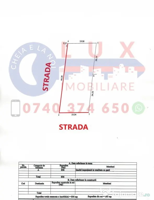 Suprafata terenului este de 856 mp si are doua fronturi stradale de 19,54 ml si de 44,39 ml.