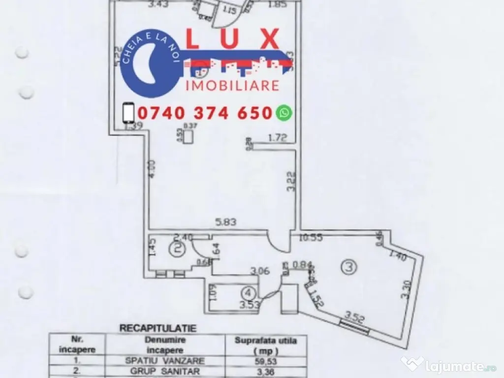 Cauti spatiu comercial? Agenția LUX Imobiliare vă oferă oportunitatea închirierii unui spațiu situat ULTRACENTRAL. Locația spațiului este una de excepție, aceasta fiind situată în inima orașului, aproape de Piața Civică si Faleza Dunării. Suprafata spatiului comercial este de 86,37 mp si este compertimentat astfel: hol intrare, camera open-space, spatiu depozitare/birou si grup sanitar. Imobilul dispune de acces stradal si o vitrina (spatiu expunere), precum si de o intrare secundara prin spatele cladirii pentru aprovizionare. Locatia este dotata cu centrala termica pe gaz si aparat de aer conditionat pentru a asigura confortul termic indiferent de anotimp. Pozitionarea si compartimentarea recomanda spatiul pentru mai multe domenii de activitate: activități comerciale, activități de consultanță, salon infrumusetare, spatiu birouri, cât și pentru sediu de firmă. PRET 1.500 EURO Contacteaza-ne pentru a obtine mai multe informatii despre acest imobil: 0740 374 650 Marin Nicolae 0744 814 740 Alina 0756 557 146 Ioana E-mail: [email protected] www.agentialuximobiliare.ro Facebook: Agentia Lux / Lux Imobiliare Sediul Agentiei Lux Imobiliare: Strada Babadag, Nr 12, Bl 6, PARTER (vis-a-vis de CEC Bank) Ne gasiti pe INSTAGRAM si pe TIK TOK Suprafaţă totală: 87 m² An finalizare construcție: 1984 Vitrină: 4 m Stadiu construcţie: Finalizat Număr încăperi: 2 Număr Grupuri Sanitare: 1 Tip imobil: Spaţiu stradal