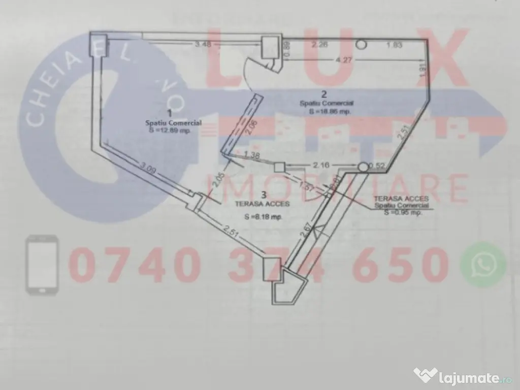 LUX Imobiliare vă oferă spre închiriere un spațiu comercial, cu o suprafață de 36,67 mp, ideal pentru birouri, cabinet, magazin sau alte activități comerciale. Detalii spațiu: 2 camere + terasă de acces Spațiu de expunere - vitrină 10 ml 2 intrări separate Dotări: aer condiționat Utilități: apă, curent, canalizare Preț: 400 €/lună Contactează-ne pentru mai multe informații și programări vizionare: 0740 374 650 – Marin Nicolae 0756 557 146 – Ioana 0744 814 740 – Alina [email protected] www.agentialuximobiliare.ro Sediul LUX IMOBILIARE: Str. Babadag, Nr. 12, Bl. 6, Parter (vis-a-vis de CEC Bank) Ne găsești și pe Instagram, YouTube & TikTok Suprafaţă totală: 37 m² An finalizare construcție: 1984 Vitrină: 10 m Stadiu construcţie: De renovat Număr încăperi: 2 Număr Grupuri Sanitare: 1 Posibilitate parcare: Da Tip imobil: Spaţiu stradal