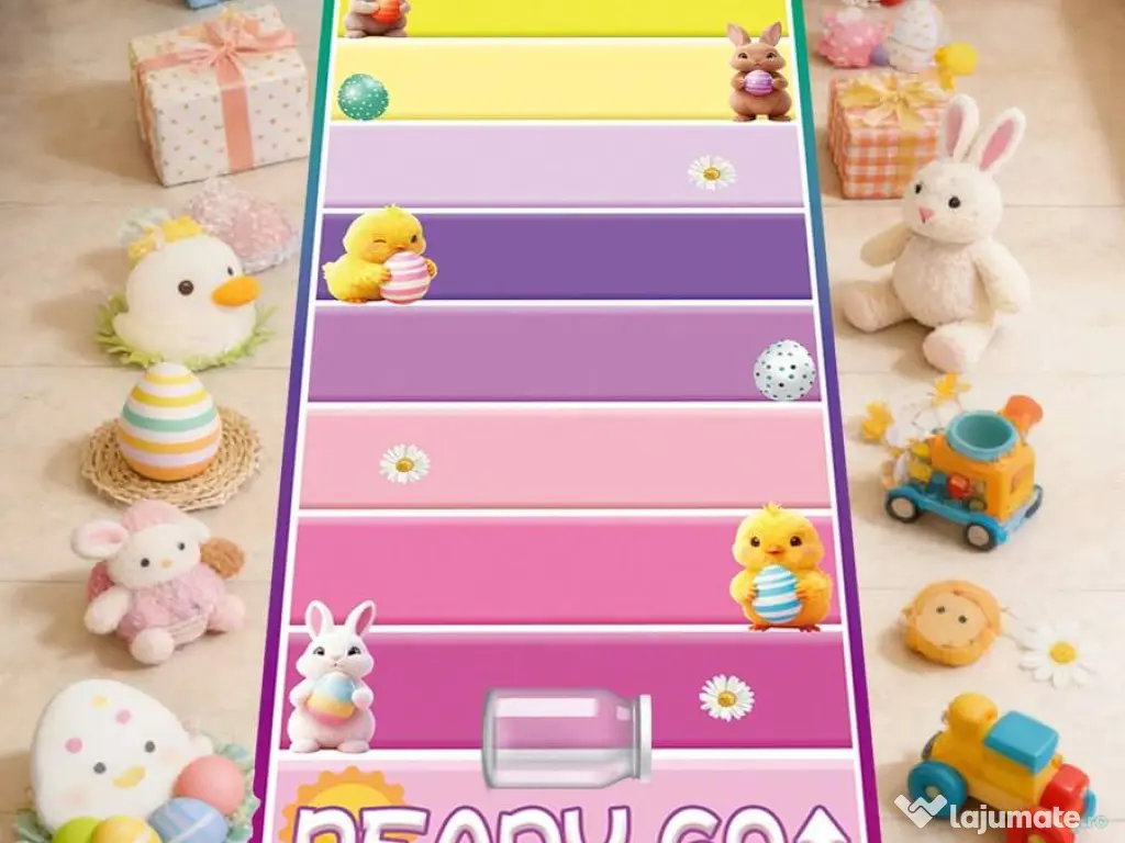 Transformă sărbătorile de Paște într-un moment plin de veselie cu acest joc interactiv de masă, perfect pentru copii și familie. Covorașul colorat cu iepurași și puișori simpatici creează o atmosferă festivă și îi provoacă pe participanți să concureze într-un mod amuzant.