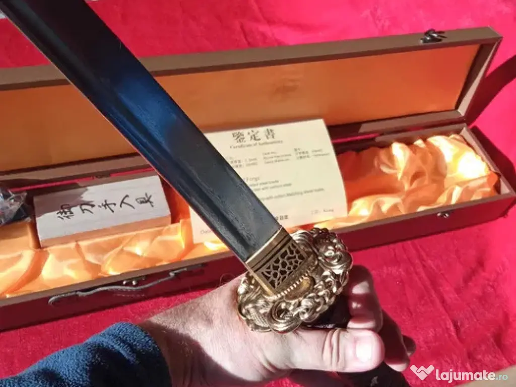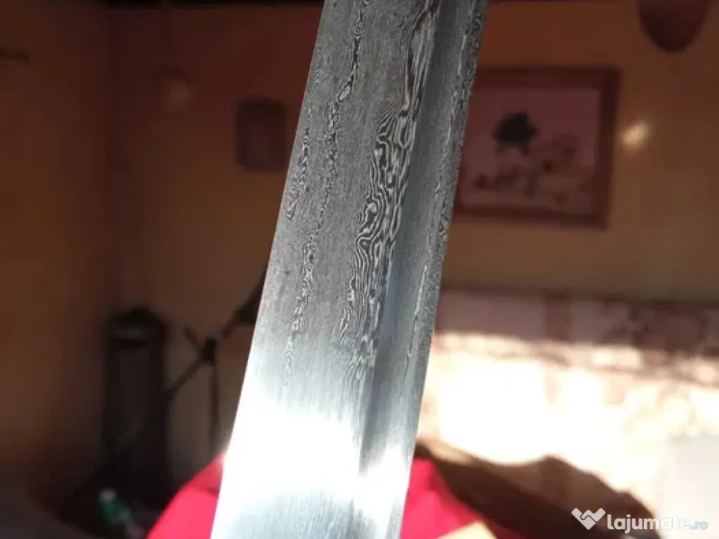 KATANA DAMASC sabie REALA samurai, perfect ASCUTITA, din Otel de DAMASC autentic (are aprox.8000 de STRATURI de otel), o piesa deosebita de LUX . O lama absolut Superba din Otel rar de Damasc foarte rezistent, CALIT si Forjat MANUAL in aprox. 8000 straturi ( straturile se vad clar absolut superb de-a lungul lamei - Otelul este insotit de CERTIFICATUL Original de forja) ! Lama sabiei este Calita Diferential conform standardelor metalurgice Japoneze clasice, adica partea groasa este din otel carbon de duritate medie iar taisul este din Otel carbon Dur foarte rezistent, in asa fel incat in lupta katana sa isi pastreze elasticitatea la impact si sa nu se rupa !