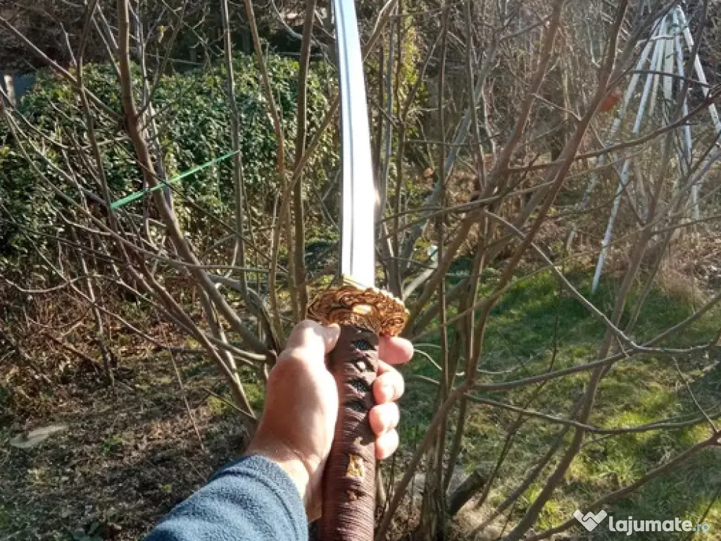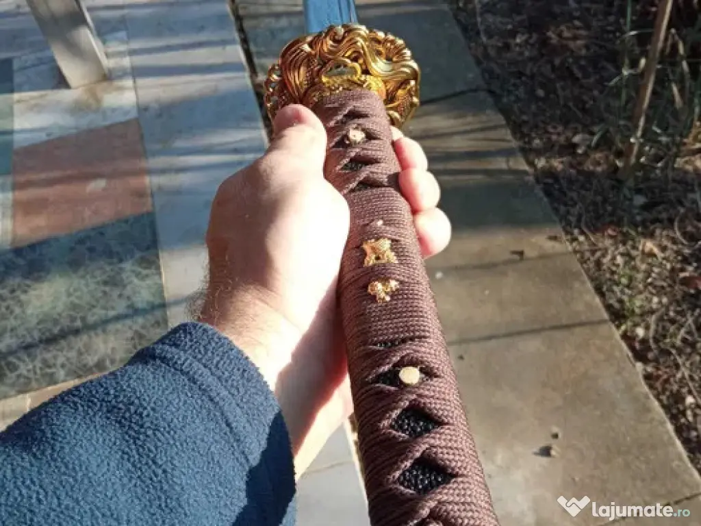 - Maner traditional full tang (otelul lamei si manerul sunt din aceiasi bucata de otel deci extrem de rezistenta) imbracat in lemn nobil de magnoliu matisat cu matase neagra japoneza si doi dragoni aurii ornamentali menuki, cu cele 2 nituri mekugi din lemn demontabile conform traditiei japoneze, imbracat in piele neagra autentica de pisica de mare, cu o Garda foarte frumoasa din bronz aurit gravata cu decoratiuni specific japoneze . O teaca deosebita din lemn natural de esenta tare foarte frumos slefuita, care scoate in evidenta intarsiile naturale ale fibrei lemnului .