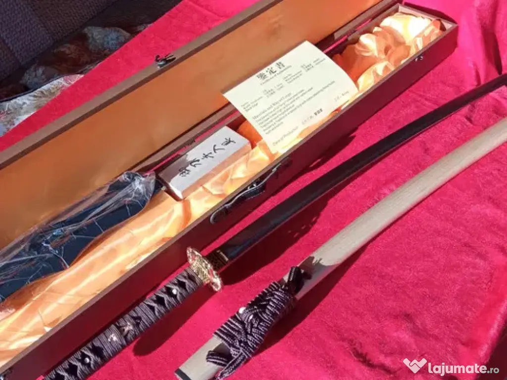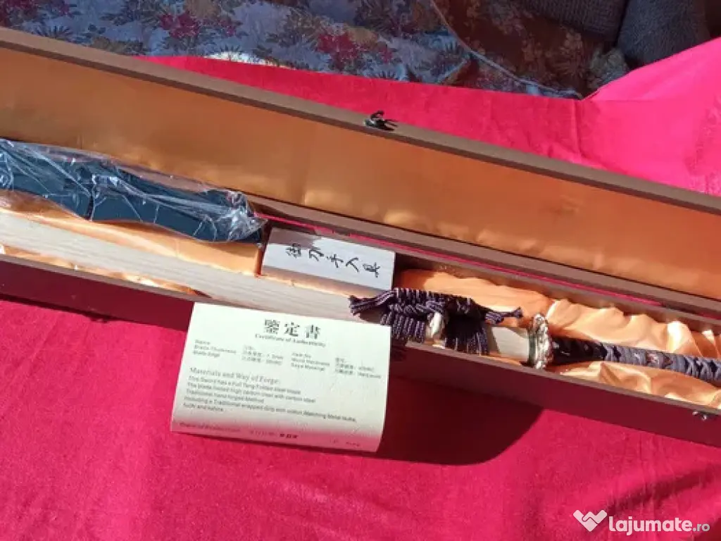 - NOUA, este insotita ca BONUS-GRATUIT de Suport Traditional de expunere (katanakake) si de Setul original specific Japonez de Curatare si Intretinere a sabiei + o frumoasa cutie de transport