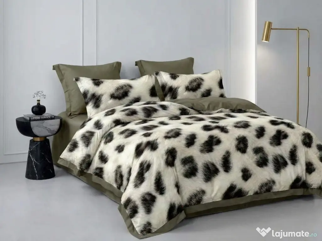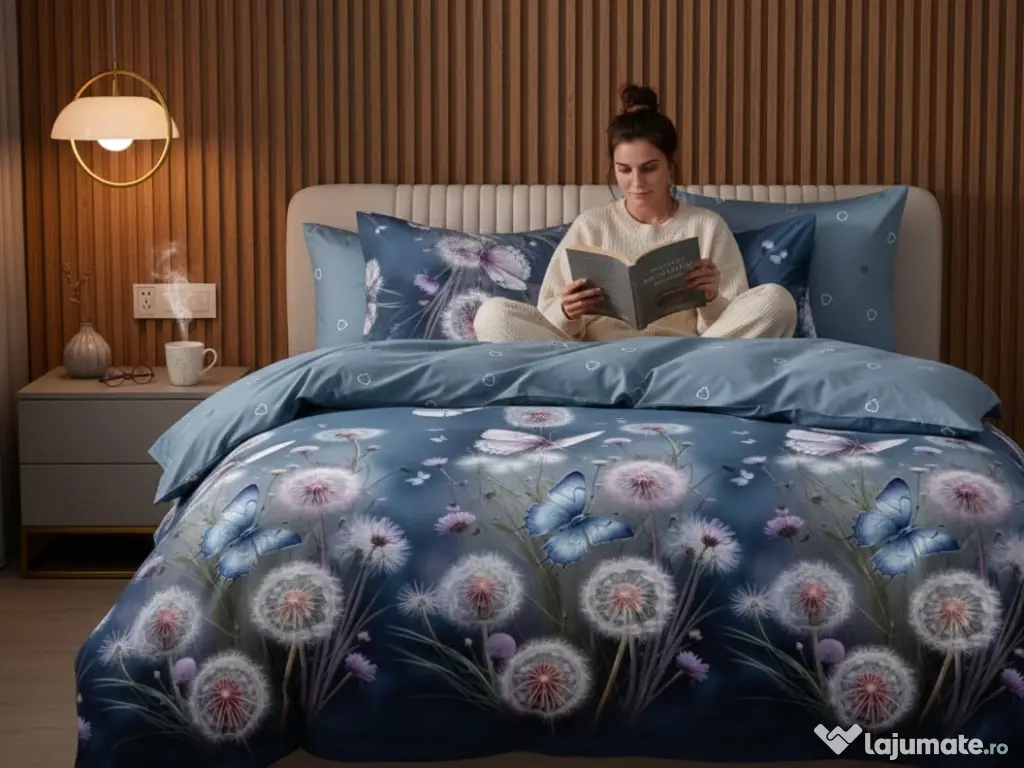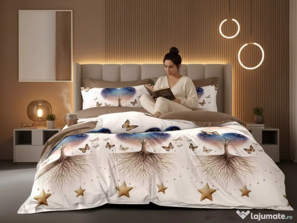 Lenjerie de pat de înaltă calitate, cu un design frumos și detalii elegante. Cuprinde o cuvertură și fețe de pernă cu diferite imprimeuri: copaci, fluturi și stele și multe altele. Culori calde și relaxante, ideale pentru a crea o atmosferă plăcută în dormitor. Livrare gratuită în toată țara.