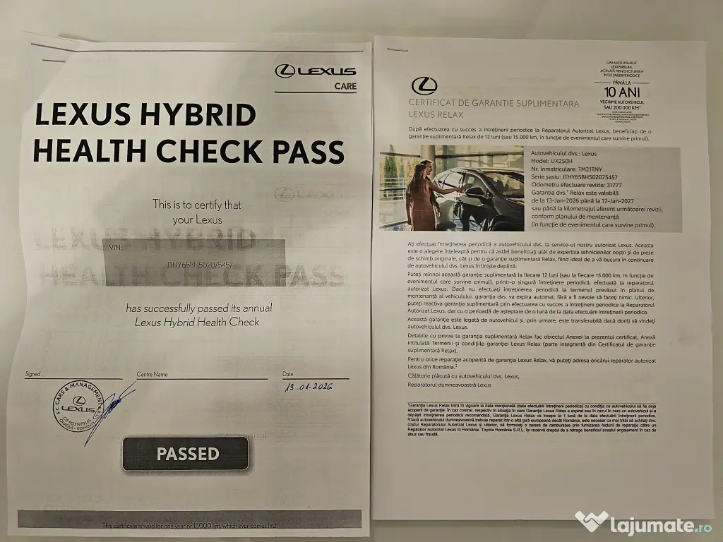 LEXUS 250h Luxury Line Mark Levinson, dotari maxime, 36000 km reali ( in crestere)! VIN: JTHY65BH502075457 -Inmatriculata -Tara de origine: Germania -Prima inmatriculare 26/03/2021 -Culoare metalizata: Atomic Silver -GARANTIE 10 ani prin programul Toyota Relax :- Pe autoturism pana in 2031 sau la limita a 200.000 km - Pe baterie si sistemul hibrid pana in 2031 sau la limita a 200.000 km -Este in stare impecabila, ca noua! -Reviziile au fost efectuate numai în reprezentanta Lexus, detin tot istoricul masini cu toate reviziile. Ultima revizie a fost efectuata in data de 13.01.2026 la 31.777 km. -Accept orice test sau verificare! Se poate verifica pe CarVertical, are istoric curat fara nici o dauna! Dotari: - Geamuri fata dublu laminate -Alarma montata din fabrica -Sistem Audio permium Mark Levinson cu 13 difuzoare -Purificator de aer Nanoe X -Climatizare Lexus Sense, simte si adapteaza temperatura ambientala, in plus adapteaza automat incalzirea/ventilatia din scaune si volan. -Lexus Paint Protection, autoreparare zgarieturi fine, protectie ce dureaza 5-8 ani -Cameră 360°, -Trapă glisantă/rabatabilă din sticlă acționată electric -Scaune: scaune ventilate pentru șofer și pasagerul față, reglare electrică a scaunelor pentru șofer și pasagerul față (pe 8 direcții), funcție de memorie pentru scaunul șoferului -Oglinzi exterioare rabatabile automat cu asistență la vizualizarea în bordură și funcție de memorie -Sistem de alarmă antifurt cu monitorizare interioară -Afișaj head-up -Cameră video pentru marșarier, -Hayon cu descidere electrica, -ISOFIX pentru scaunul de copii -Climatizare automată -Incarcator cu inductie pentru smartphone, -Volan reglat electric cu memorie - Doua chei + o cheie tip card Lexus -Asistență la parcare Lexus cu asistență la frânare - Sistem de siguranță Lexus+ -Navigație: sistem de navigație Lexus cu harta UE + Romania -Faruri: Matrix LED, autoadaptive, faza lunga automata si adaptiva cu functie de antiorbire -Monitorizare unghi mort (BSM) cu (RCTA) asistent la schimbarea benzii -Airbag: dezactivare airbag pasager, airbag: airbag frontal, pentru genunchi și lateral - Ceas analogic -Sistem antiblocare (ABS) -Control al tracțiunii (TRC) -Oglinzi exterioare încălzite, acționate electric, rabatabile electric si cu fuctie antiorbire -Asistență la pornirea în rampă -Semnalizatoare LED și stopuri LED -Sine de plafon din aluminiu -Inserții decorative cu design Washi (hârtie japoneză) -E-Call, sistem automat de apel de urgență -Mod EV (mod vehicul electric) -Manere guri de ventilatie iluminate (disponibile doar pe varianta Luxury) -Iluminare acces a manerelor de la usi -Sistem de iluminare acces pentru interior a spațiului pentru picioare -Praguri uși Inscripție Lexus din aluminiu -Distribuție electronică a forței de frânare (EBD) -Selector mod de condus (ECO, NORMAL, SPORT) -Cutie de viteza: E-CVT, automată, variabilă continua -Sistem de avertizare centură de siguranță, vizual și sonor -Ștergător lunetă -Eleron spate -Oglindă retrovizoare cu reglaj antiorbire -Tetiere reglabile pe înălțime -Vopsea metalizata -Volan din piele, design cu 3 spițe, încălzit cu reglaj electric si memorie -Jante din aliaj de 18 inch cu 5 spițe -Keyless entry si Keyless Go -Cotieră centrală față cu compartiment de depozitare integrat -Afișaj multifuncțional de 10,3 inch -Proiectoare de ceață cu funcție de virare, Lampă de ceață spate, LED -Frână de mana electromecanică -Radio: recepție radio analogică și digitală -Accesorii radio: Interfață Bluetooth -Senzor de ploaie -Senzori lumini -Sistem de monitorizare a presiunii în anvelope (TPWS) -Scaune spate rabatabile divizate (60:40) -Servodirecție electronică (EPS) -Siguranță: Pretensionatoare centuri de siguranță față/spate -Centuri de siguranță automate în 3 puncte, -Scaune: Suport lombar electric (față), -Scaune: Tapițerie din piele -Scaune: Scaune față încălzite -Controlul stabilității vehiculului (VSC) -Selector de viteze din piele -Închidere centralizată -Priză de alimentare accesorii 12V -Priza USB Confort: -Afișaj head-up -Cameră video marșarier -Hayon acționat electric -Control climatic automat dublu -Incarcator inductie pentru smartphone--Card Lexus Key -Sistem audio premium Mark Levinson -Asistență inteligentă la parcare Lexus -Sistem de navigație Lexus -Scaune din piele -Scaune ventilate și încălzite -Scaune reglabile electric cu memorie -Volan incalzit Siguranță: -Sistem de siguranță Lexus+ -Senzor de ploaie -Asistență unghi mort -Faruri Matrix LED -ISOFIX -camere video 360° -Sistem de apel de urgență eCall