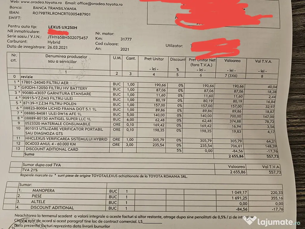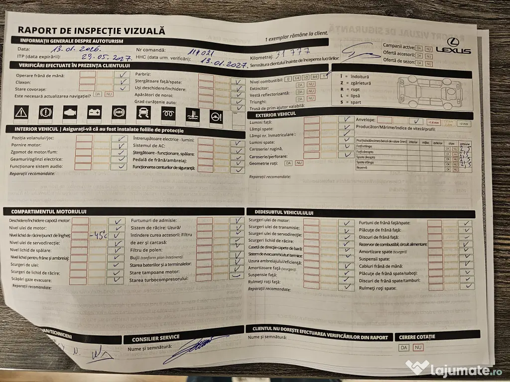 LEXUS 250h Luxury Line Mark Levinson, dotari maxime, 36000 km reali ( in crestere)! VIN: JTHY65BH502075457 -Inmatriculata -Tara de origine: Germania -Prima inmatriculare 26/03/2021 -Culoare metalizata: Atomic Silver -GARANTIE 10 ani prin programul Toyota Relax :- Pe autoturism pana in 2031 sau la limita a 200.000 km - Pe baterie si sistemul hibrid pana in 2031 sau la limita a 200.000 km -Este in stare impecabila, ca noua! -Reviziile au fost efectuate numai în reprezentanta Lexus, detin tot istoricul masini cu toate reviziile. Ultima revizie a fost efectuata in data de 13.01.2026 la 31.777 km. -Accept orice test sau verificare! Se poate verifica pe CarVertical, are istoric curat fara nici o dauna! Dotari: - Geamuri fata dublu laminate -Alarma montata din fabrica -Sistem Audio permium Mark Levinson cu 13 difuzoare -Purificator de aer Nanoe X -Climatizare Lexus Sense, simte si adapteaza temperatura ambientala, in plus adapteaza automat incalzirea/ventilatia din scaune si volan. -Lexus Paint Protection, autoreparare zgarieturi fine, protectie ce dureaza 5-8 ani -Cameră 360°, -Trapă glisantă/rabatabilă din sticlă acționată electric -Scaune: scaune ventilate pentru șofer și pasagerul față, reglare electrică a scaunelor pentru șofer și pasagerul față (pe 8 direcții), funcție de memorie pentru scaunul șoferului -Oglinzi exterioare rabatabile automat cu asistență la vizualizarea în bordură și funcție de memorie -Sistem de alarmă antifurt cu monitorizare interioară -Afișaj head-up -Cameră video pentru marșarier, -Hayon cu descidere electrica, -ISOFIX pentru scaunul de copii -Climatizare automată -Incarcator cu inductie pentru smartphone, -Volan reglat electric cu memorie - Doua chei + o cheie tip card Lexus -Asistență la parcare Lexus cu asistență la frânare - Sistem de siguranță Lexus+ -Navigație: sistem de navigație Lexus cu harta UE + Romania -Faruri: Matrix LED, autoadaptive, faza lunga automata si adaptiva cu functie de antiorbire -Monitorizare unghi mort (BSM) cu (RCTA) asistent la schimbarea benzii -Airbag: dezactivare airbag pasager, airbag: airbag frontal, pentru genunchi și lateral - Ceas analogic -Sistem antiblocare (ABS) -Control al tracțiunii (TRC) -Oglinzi exterioare încălzite, acționate electric, rabatabile electric si cu fuctie antiorbire -Asistență la pornirea în rampă -Semnalizatoare LED și stopuri LED -Sine de plafon din aluminiu -Inserții decorative cu design Washi (hârtie japoneză) -E-Call, sistem automat de apel de urgență -Mod EV (mod vehicul electric) -Manere guri de ventilatie iluminate (disponibile doar pe varianta Luxury) -Iluminare acces a manerelor de la usi -Sistem de iluminare acces pentru interior a spațiului pentru picioare -Praguri uși Inscripție Lexus din aluminiu -Distribuție electronică a forței de frânare (EBD) -Selector mod de condus (ECO, NORMAL, SPORT) -Cutie de viteza: E-CVT, automată, variabilă continua -Sistem de avertizare centură de siguranță, vizual și sonor -Ștergător lunetă -Eleron spate -Oglindă retrovizoare cu reglaj antiorbire -Tetiere reglabile pe înălțime -Vopsea metalizata -Volan din piele, design cu 3 spițe, încălzit cu reglaj electric si memorie -Jante din aliaj de 18 inch cu 5 spițe -Keyless entry si Keyless Go -Cotieră centrală față cu compartiment de depozitare integrat -Afișaj multifuncțional de 10,3 inch -Proiectoare de ceață cu funcție de virare, Lampă de ceață spate, LED -Frână de mana electromecanică -Radio: recepție radio analogică și digitală -Accesorii radio: Interfață Bluetooth -Senzor de ploaie -Senzori lumini -Sistem de monitorizare a presiunii în anvelope (TPWS) -Scaune spate rabatabile divizate (60:40) -Servodirecție electronică (EPS) -Siguranță: Pretensionatoare centuri de siguranță față/spate -Centuri de siguranță automate în 3 puncte, -Scaune: Suport lombar electric (față), -Scaune: Tapițerie din piele -Scaune: Scaune față încălzite -Controlul stabilității vehiculului (VSC) -Selector de viteze din piele -Închidere centralizată -Priză de alimentare accesorii 12V -Priza USB Confort: -Afișaj head-up -Cameră video marșarier -Hayon acționat electric -Control climatic automat dublu -Incarcator inductie pentru smartphone--Card Lexus Key -Sistem audio premium Mark Levinson -Asistență inteligentă la parcare Lexus -Sistem de navigație Lexus -Scaune din piele -Scaune ventilate și încălzite -Scaune reglabile electric cu memorie -Volan incalzit Siguranță: -Sistem de siguranță Lexus+ -Senzor de ploaie -Asistență unghi mort -Faruri Matrix LED -ISOFIX -camere video 360° -Sistem de apel de urgență eCall
