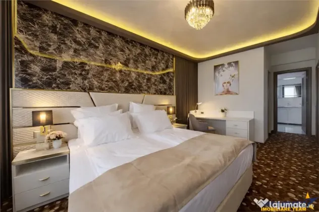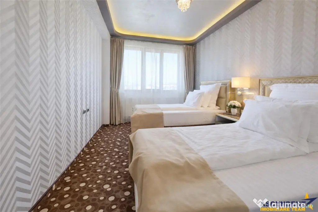 Dormitorul matrimonial este amenajat cu bun gust, avand un birou, acces la un dressing spatios si baie proprie. Patul king size cu dimensiuni de 200x200 cm si saltea ortopedica asigura un somn odihnitor, iar draperiile black-out ofera intimitate si confort. Dormitorul secundar este echipat cu paturi twin, fiind ideal pentru copii sau oaspeti,