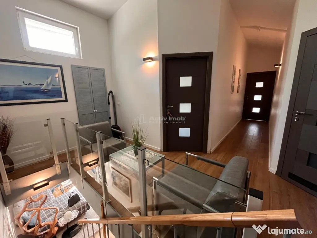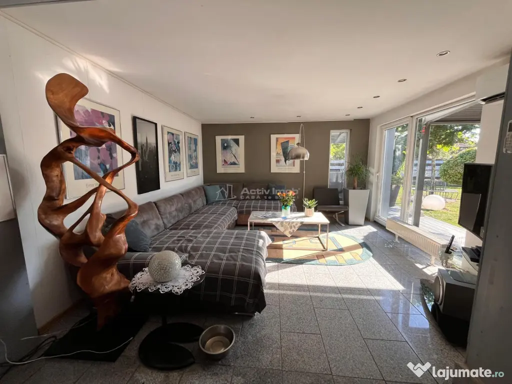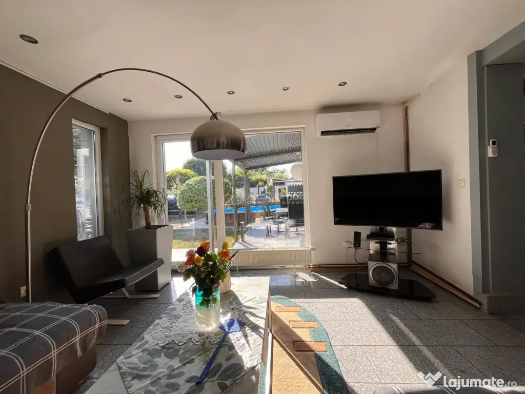 BENEFICII PENTRU CLIENTII ACESTEI OFERTE: Comision ZERO pentru clientul cumparator! 1. Beneficii tehnice ale ofertei; Vila moderna, oaza de liniste cu piscina privata, complet mobilata si utilata, gata de mutare. Curte intima, terasa acoperita si loc ideal pentru relaxare. Se vinde exact ca in poze (mobilata si utilata complet, cu frigidere, aragaze, masini de spalat rufe, masina de spalat vase, aer conditionat, televizoare si tot ce este nevoie). Suprafata totala teren 820 mp. Doua corpuri de cladire independente in aceeasi curte CORPUL 1 - VILA S P 1 (TREI NIVELE) Suprafata desfasurata totala 286 mp. Suprafata construita la sol 103,7 mp. CORPUL 2 - CASA P E (PARTER ETAJ) Suprafata desfasurata totala 154 mp. Suprafata construita la sol 95,6 mp. Ambele cladiri sunt construite din caramida, cu structura solida si izolatie exterioara care asigura confort termic si eficienta energetica. Materialele folosite sunt de calitate, iar constructia este realizata cu atentie la detalii si durabilitate. Primul corp este acoperit cu tigla, iar al doilea cu tabla, ambele oferind protectie buna in timp Ferestrele sunt din termopan, iar usile sunt din termopan, lemn dar si usi glisante din sticla, combinand eficienta cu un aspect placut. Incalzirea este asigurata atat prin centrala termica pe gaz, cat si prin centrala termica pe lemne, cu calorifere in toate camerele - eficient si economic in functie de preferinta sau sezon. In partea din fata a proprietati este amplasat un sistem de imprejmuire modern, realizat din material compozit de tip WPC mdash; o combinatie intre lemn si plastic, cu aspect elegant si intretinere redusa. In aceasta structura sunt integrate cele doua puncte de acces: o poarta pietonala clasica si o poarte auto cu deschidere automata. O parte din curte este pavata si include doua containere metalice pentru depozitare, precum si un garaj acoperit. Zona verde este formata din gazon bine intretinut si mai multi copaci decorativi, printre care se numara tuia, platan si arbori globulari taiati estetic. Curtea este dotata cu o piscina supraterana, intretinuta cu un robot automat de curatare pentru apa. Corp 1 ndash; Subsol Parter Etaj Subsol: doua incaperi generoase pentru depozitare si o spalatorie functionala, cu acces atat din curte, cat si din interiorul casei. - Parter: - bucatarie complet utilata, cu spatiu de lucru generos si loc de servit masa. - camera primitoare pentru oaspeti, ideala si ca spatiu pentru relaxare. - baie spatioasa, dotata cu cada si ventilatie naturala. - spatiu de depozitare discret integrat, ideal pentru organizare. - Etaj: - doua birouri luminoase si spatioase, unul cu iesire catre o terasa privata. - o a treia camera, perfecta pentru birou secundar sau zona creativa. - baie de serviciu pentru etaj. Corp 2 ndash; Parter Etaj - Parter: - hol de acces generos, cu un colt cochet amenajat gen coffee nook ndash; ideal pentru momente de relaxare. - living spatios si bucatarie open-space, armonios integrate, cu design modern si functional. - dormitor matrimonial elegant si primitor. - Baie eleganta si luminoasa, dotata cu o cada moderna de sine statatoare si un dus walk-in spatios cu finisaje in nuante naturale ndash; un spatiu care imbina perfect functionalitatea cu rafinamentul. - terasa ac Număr Băi: 4 Posibilitate parcare: Da Nr. locuri parcare: 3 Curent Apă Canalizare Gaz Subsol