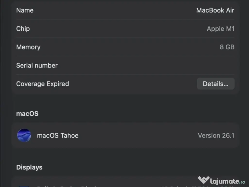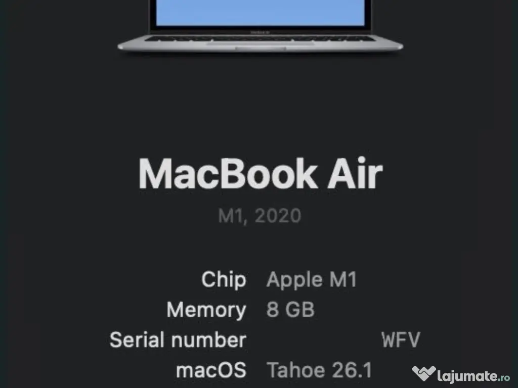 Vând MacBook Air cu procesor M1, 256 GB, RAM - 8 GB, în stare perfectă. Sănătatea bateriei este de 92%. Aspect impecabil, nu are niciun defect. Se vinde împreună cu cutia originală și încărcătorul original. A fost achiziționat nou de pe eMag. Nu accept schimburi. Prețul este negociabil.