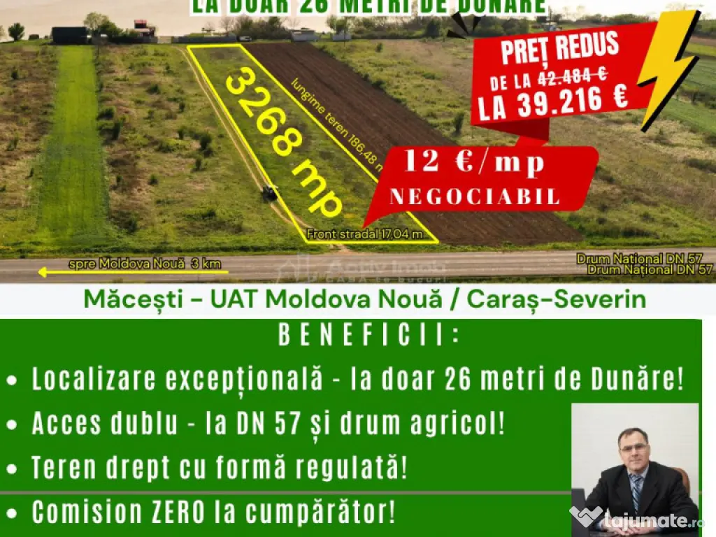 Front stradal: 17 m la Drumul National DN57, Lungime: peste 186 metri liniari