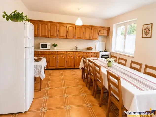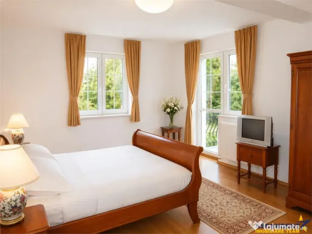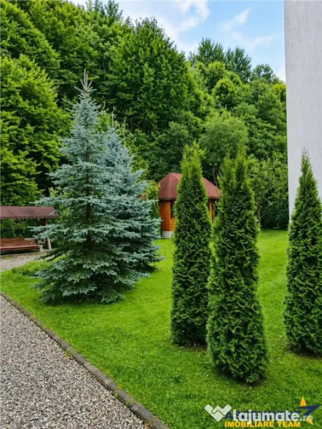 Proprietatea se intinde pe o suprafata totala de 500 mp si este compusa dintr-un living spatios de 50 mp, complet mobilat, si o bucatarie generoasa de 30 mp, mobilata cu lemn de stejar si utilata complet. Bucataria dispune de toate avizele necesare de la DSVSA si ISU pentru a functiona ca pensiune. Mai mult, imobilul include doua apartamente cu cate doua camere, fiecare avand baie proprie, mobilate si utilate complet, precum si sapte camere, fiecare cu baie proprie, mobilate si utilate complet, garantand confortul si intimitatea oaspetilor.
