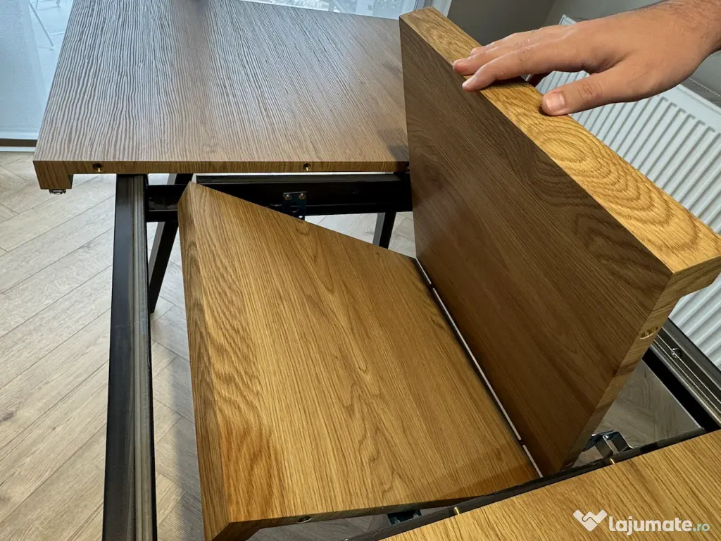 Vand masa extensibila, blat din MDF de culoare stejar, cadru negru din metal.