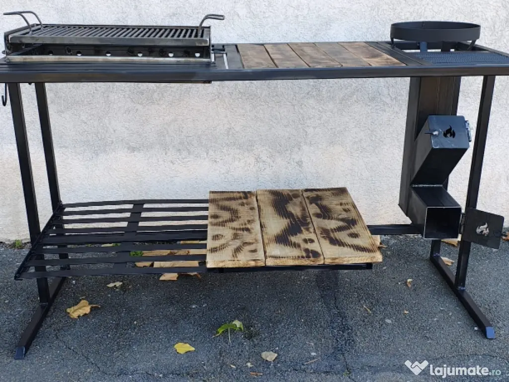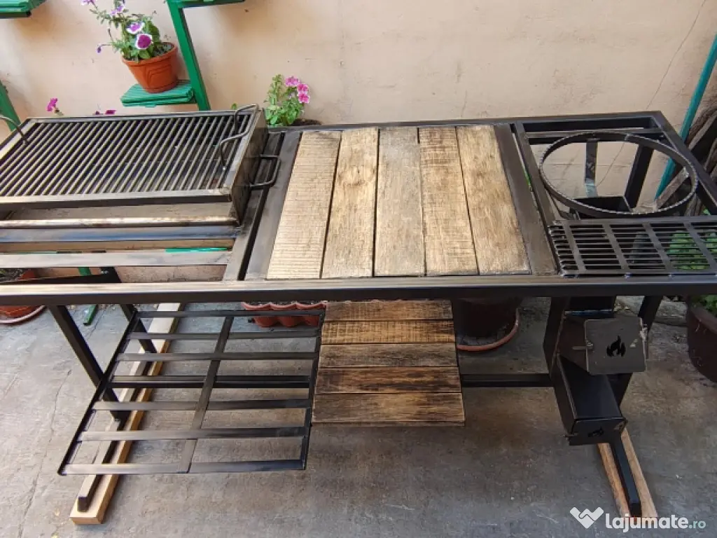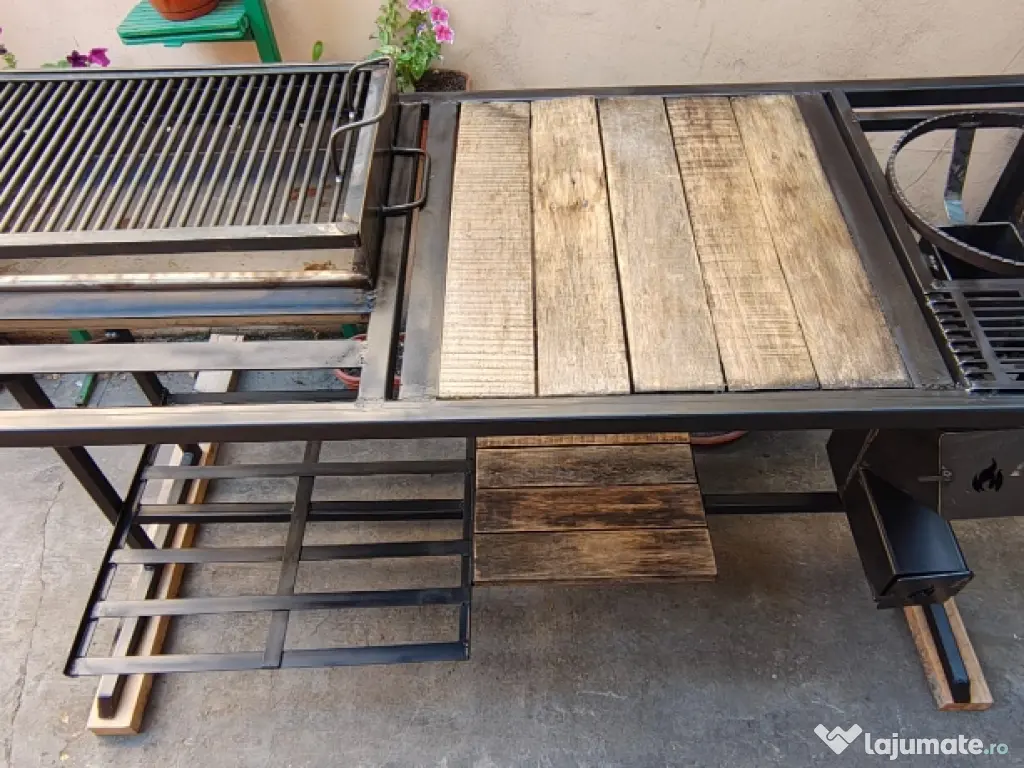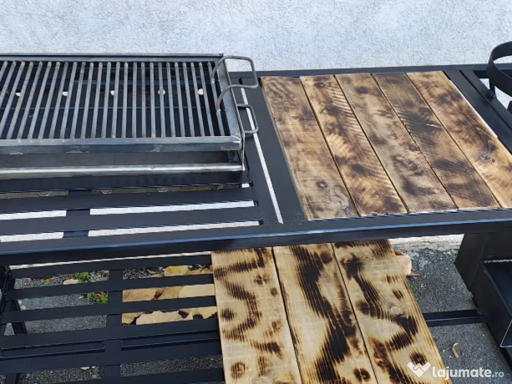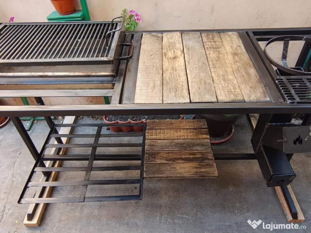 Vând masa grătar cu lungimea totala de 157 cm. Grătarul are dimensiunile de 60x37x10 reglabil pe 2 înălțimi, înălțimea mesei este de 94 cm iar lățimea de 61cm (157x61x94). Masa de lucru are dimensiunea de 53x50. Include gratarul și soba racheta exact cum se vede in imagine. Scheletul este din rectangular gros si vopsit cu vopsea termica.