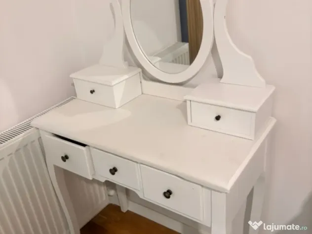 Vând măsuță de machiaj în stare foarte bună, achiziționată acum câteva luni. Produsul a fost întreținut cu grijă, a avut folie de protecție, iar suprafața se prezintă impecabil, fără zgârieturi sau urme vizibile de uzură. Se vinde deoarece nu mai este utilizată. A fost cumpărată din JYSK CU 900 lei se vine cu Preț 600 lei