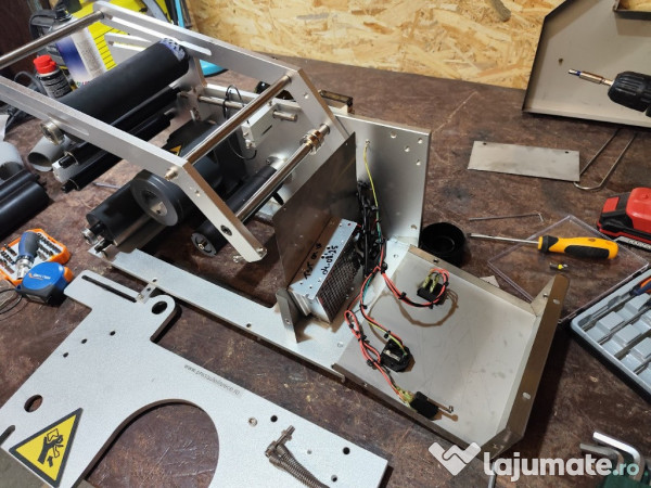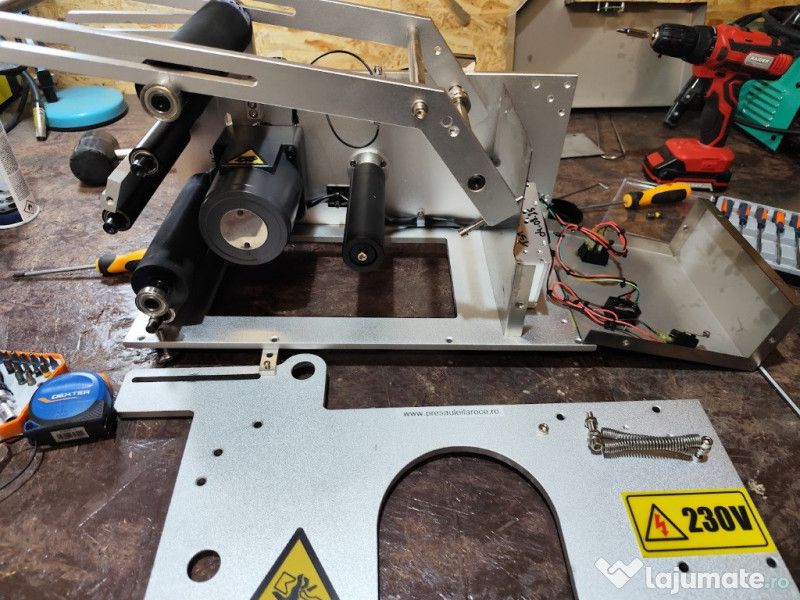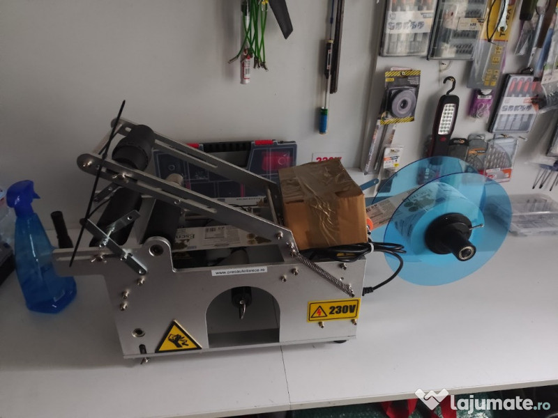 Masina etichetare recipiente cilindrice. Masinile se fac la comanda in functie de recipientul clientului. Alimentare 220V, 0.12kw