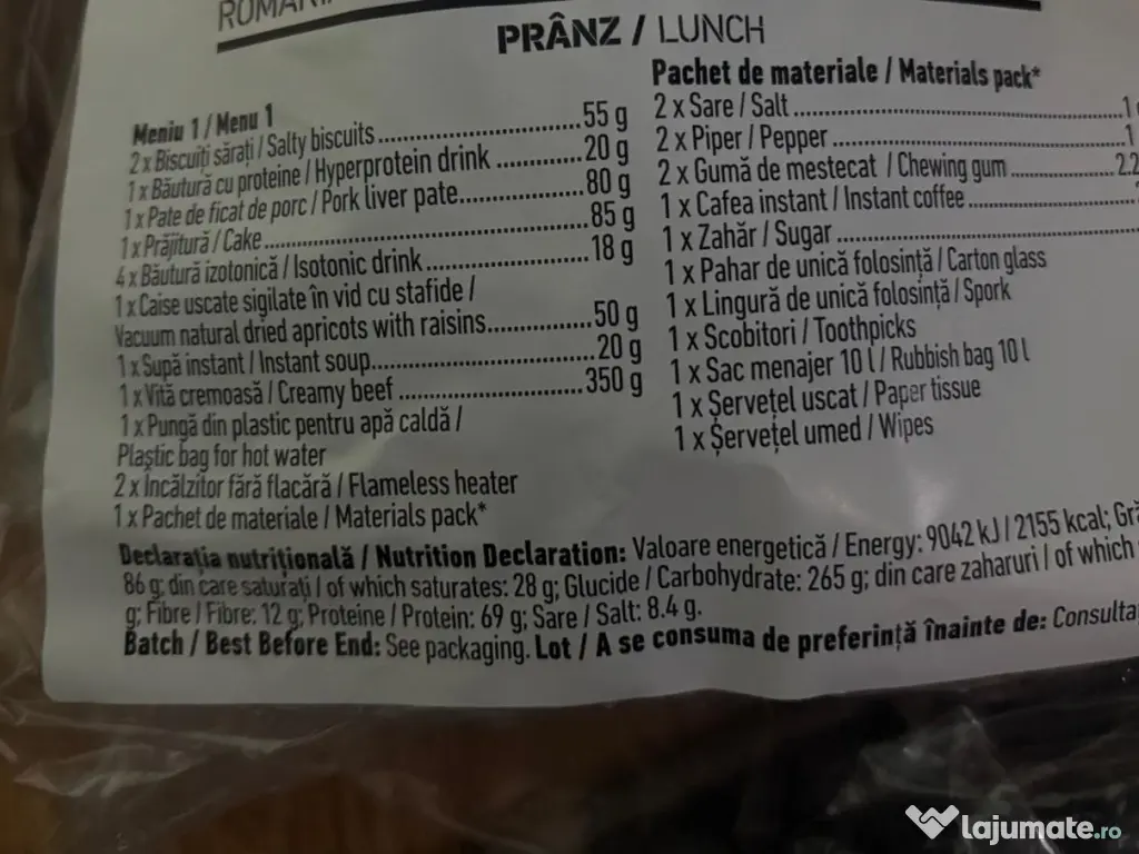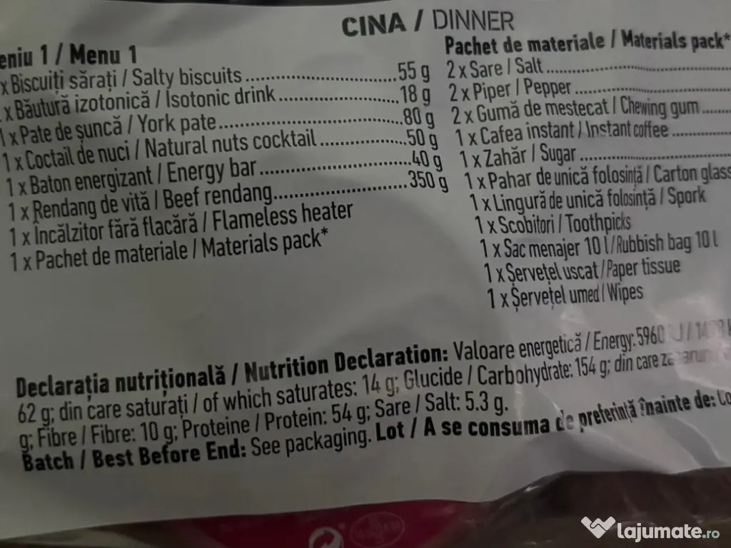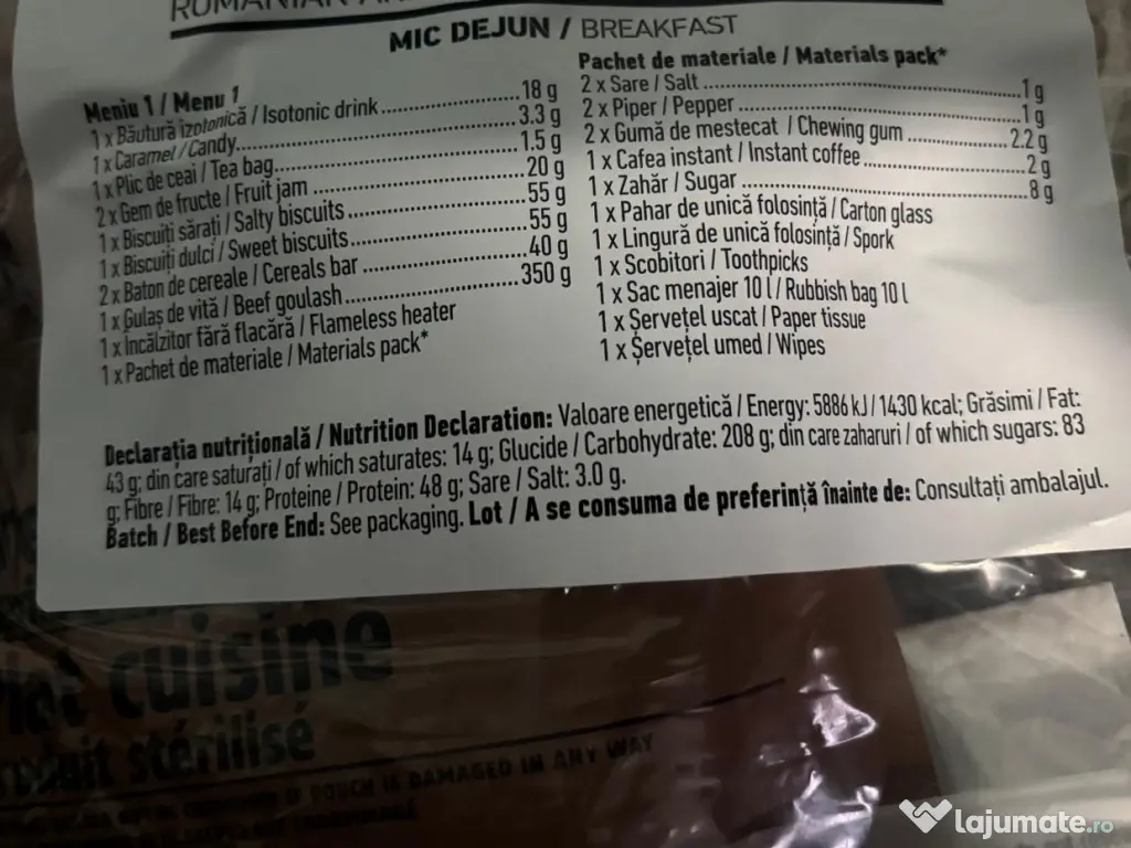 Pot oferi și pungi pentru încălzit, biscuiți, plicuri cu pudră proteică sau băutură izotonică separat în funcție de nevoi. Prețurile sunt negociabile pentru comenzile mai mari în limita bunului simț.