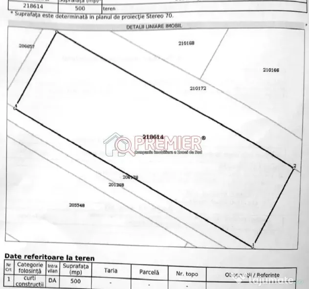 Va propunem spre achizitie un lot de teren in suprafata de 500mp, avand deschidere la calea de acces (drum servitute) de 39m.