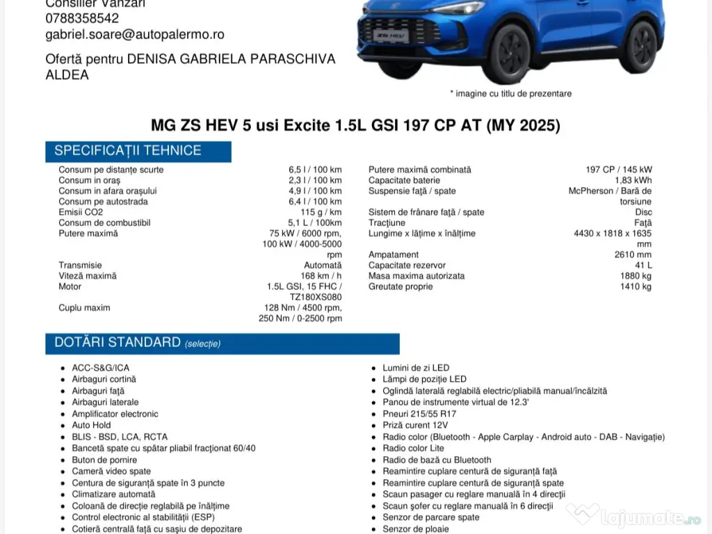 Mg zs hev hybrid Excite, automata 1,5 L 197 CP , ca noua , doar 14000 km , garanție încă 6 ani ! Dotările masinii le aveți în pozele încărcate! Pentru mai multe informații nu ezitați să mă contactați