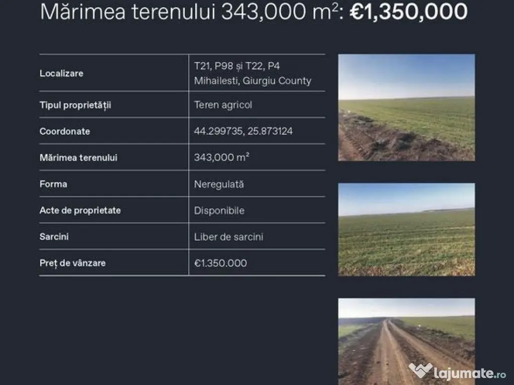 Imobiliar Expert Grup va propune spre vanzare un teren de 34,3 ha amplasat in orasul Mihailesti jud. Giurgiu. Properietatea cuprinde 463 de parcele divizate din doua parcele adiacente anterior, mäsurând in total 343,000 mp. Terenul se aflã la circa 250 m vest de DN6. Vis-a-vis de DN6, se aflã un mic complex de relaxare, cu un mic hotel, cu restaurant si piscină, care poate atrage trafic de tranzit si persoane . Este un loc cu potential favorabil unui complex industrial-logistic, care poate fi dezvoltat, având in vedere caracteristicile fizice. Terenul poate fi folosit oricând pentru lucräri agricole sau ca parc fotovoltaic., pentru dezvoltarea unui proiect rezidential cu case, tinand cont ca in vecinatate, la aproximativ 1 km, un astfel de proiect se afla in derulare.