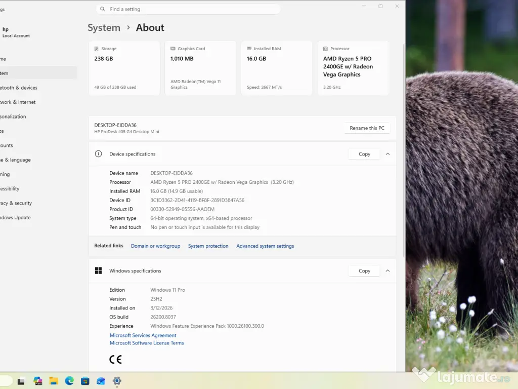 - Windows 11 PRO instalat și activat cu licență originală integrată de HP in Bios