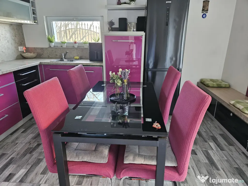 Vand bucatarie moderna din 2023 din mdf super. Bucataria se vinde echipata cu electrocasnicele montate pe ea - hota,masina spalat vase,cuptor electric si plita electrica . Deasemenea chiuveta si bateria de bucatarie . mobila se vinde completa iar demontarea se face de catre cumparator pentru a evita anumite erori de montare demontare . Bucataria este prevazuta cu blat si perete special de strop. Comoda este inclusa in bucatarie compusa din trei sertare silentioase . Toate sunt aproape noi mobila nu a fost prea folosita. Deasemenea se da si masa din sticla cu cele patru scaune . 340*150
