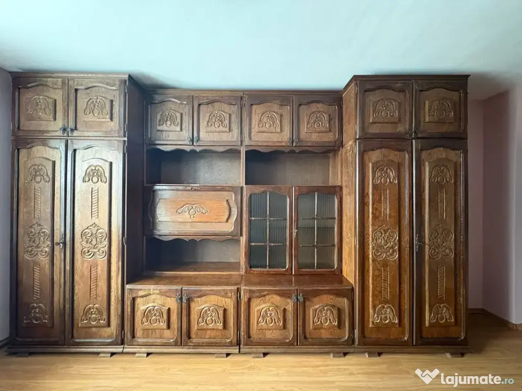 Mobilă veche din lemn masiv, cu elemente decorative sculptate manual. Compusă din mai multe corpuri, oferă spațiu de depozitare generos.