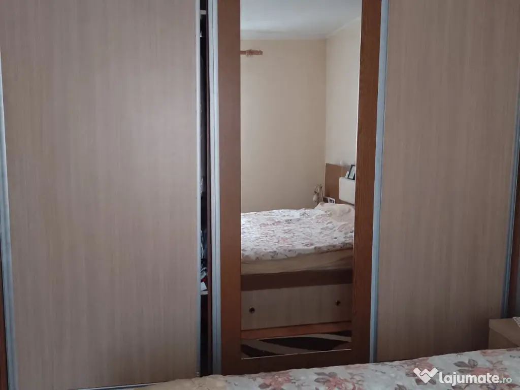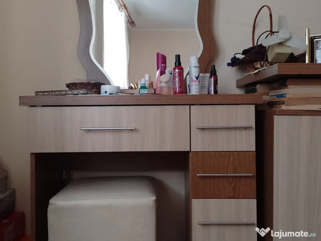 -Mobilier de dormitor în stare bună, cu o oglindă decorativă . Acesta include dulapuri, sertare și spațiu de depozitare, fiind un mobilier practic și funcțional pentru amenajarea unei camere de dormit.