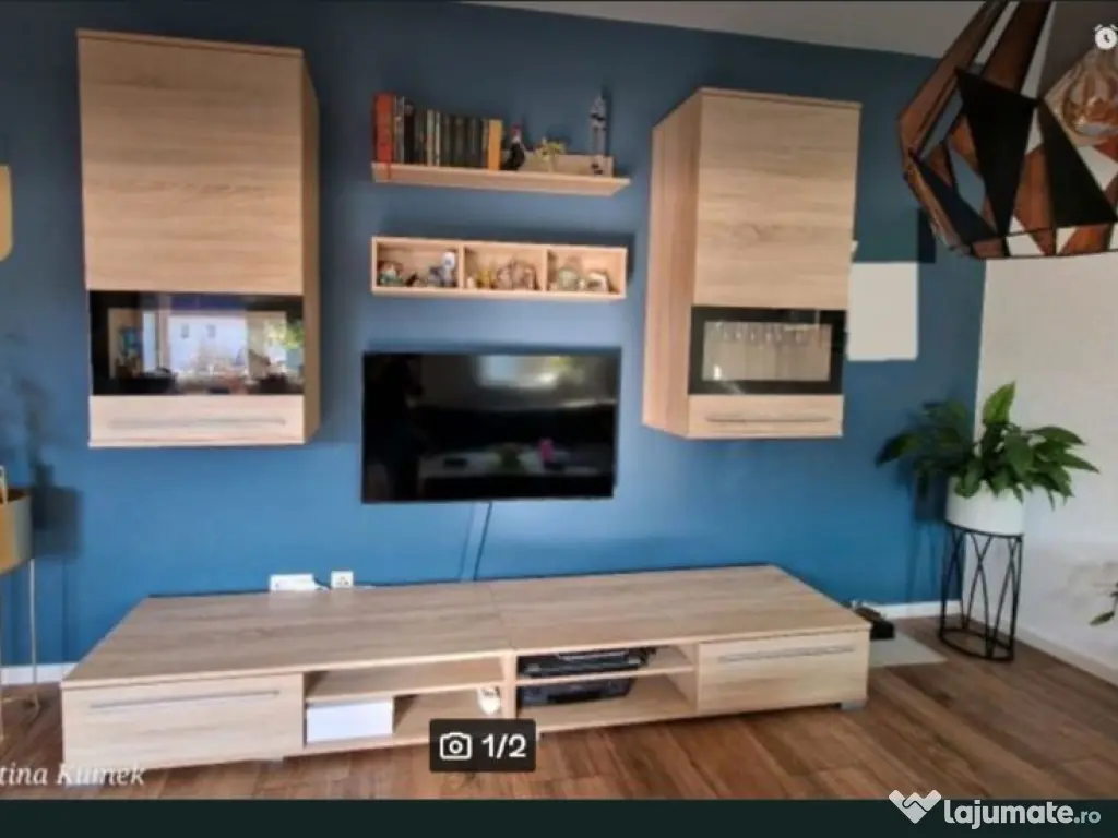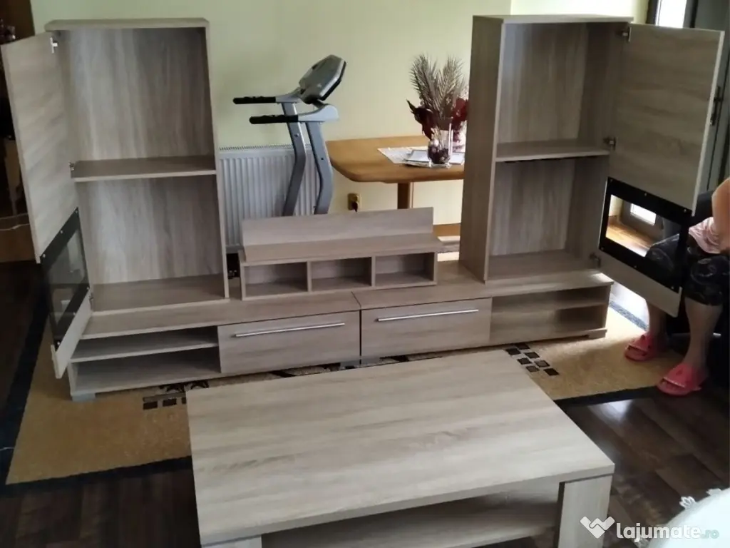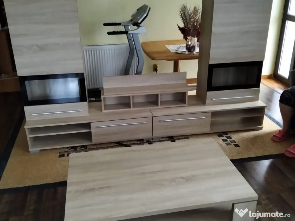 Mobilier de sufragerie cu masa, 2 suspendate, 2 polițe suspendate, 2 comode jos, stare buna.